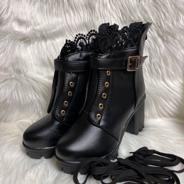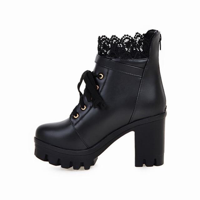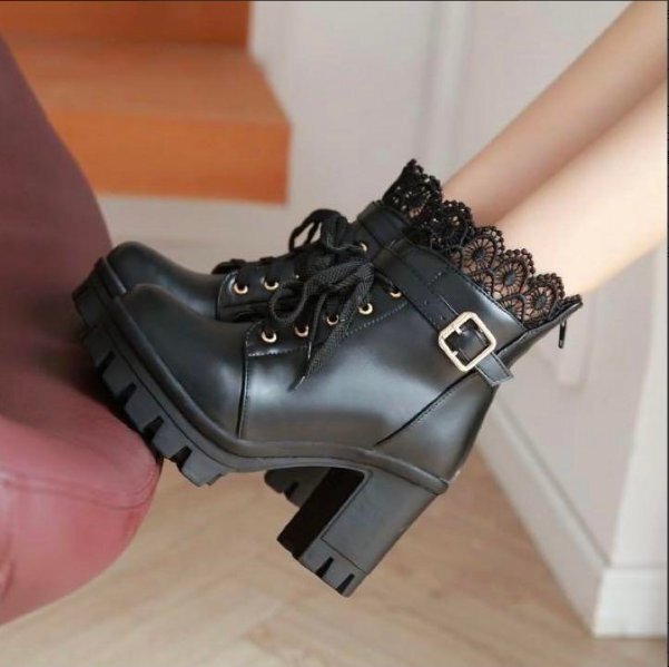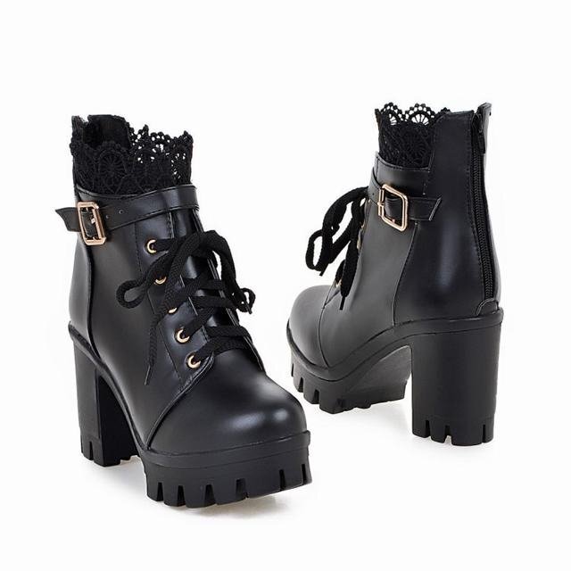 厚底 ショートブーツ レディース靴 レース ハイヒール 太ヒール ハイカット PU革 韓流 婦人靴 ブラック 23CM