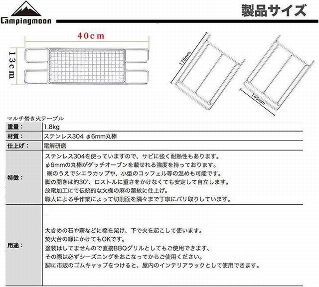 ステンレス304製のパイプが軽く錆びにくい、さらに電解研磨(ヘアライン加工より処理コストが高く、汚れがくっ付きにくい処理方式になります) 、高熱でも変形しにくい仕様です。 φ6mmの丸棒が小型ダッチオーブンを載せれる強度を持っております。網のうえでシエラカップや、小型のコッフェル等の温めも可能です。