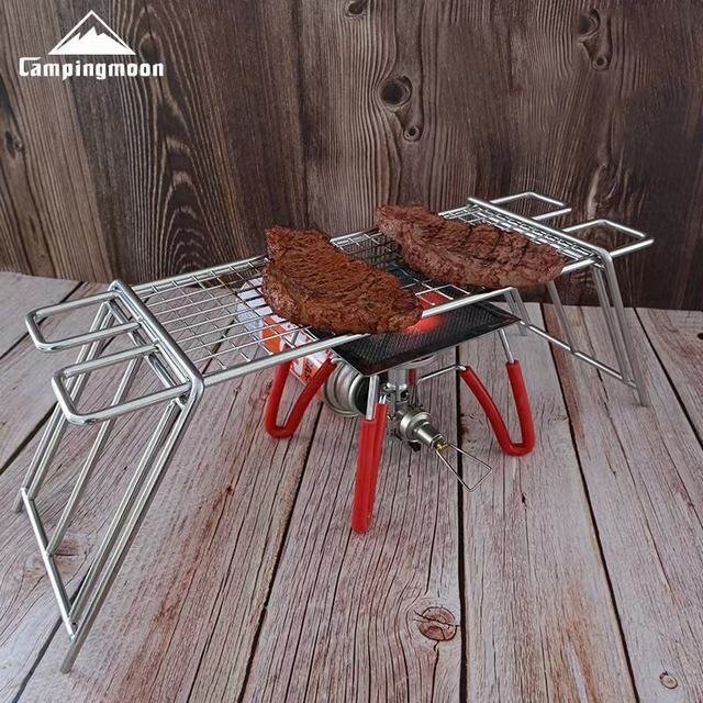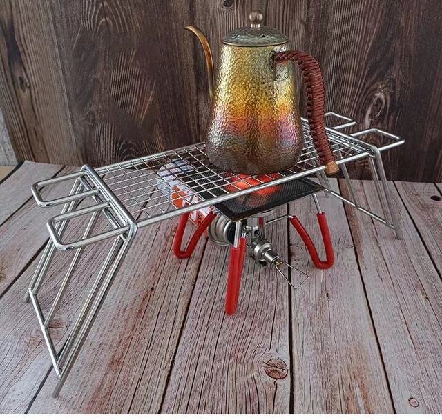 キャンプ焚火の時だけではなくちょっとしたピクニックや登山にもお使いいただけます。 こちらのセットは高さが設置時に14cmくらいの為シングルバーナー等での使用が最適かと思われます。また、クッカースタンドとして使用したりシングルバーを要して焼き肉やクッキングもできる万能スタンドです。