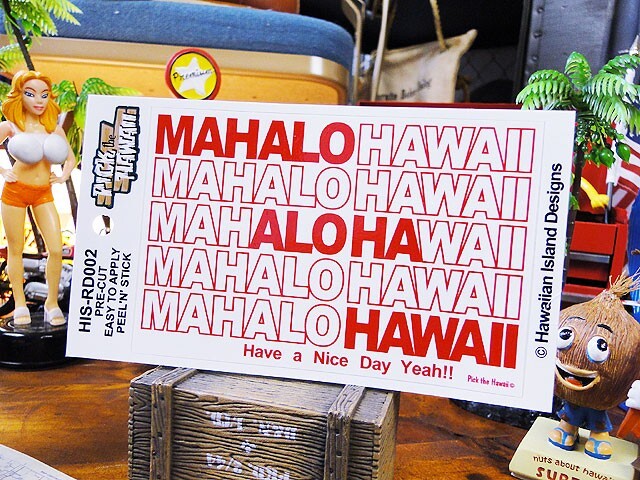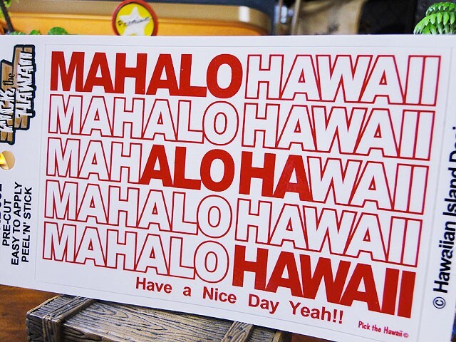 アメリカのスーパーで買い物をするともらえるレジ袋、通称サンキューバッグをモチーフに、マハロハワイってフレーズでデザインしたハワイアンステッカーです。