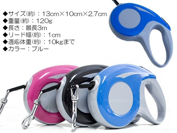 便利なロック機能付き!犬用伸縮リード 3m/3メートル 自動巻き取り ブルー 青 散歩用リード コンパクト ペット用品 散歩グッズ