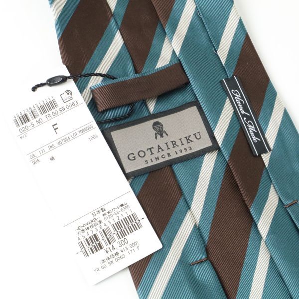 | ** ブランド:gotairiku / 五大陸 ** 素材:絹100% ** 状態: 新品 未使用 ** 色:グリーンxブラウン系 ** 実寸サイズ(単位cm) ※多少の誤差はご了承ください: 長さ145幅8.5 ** 原産: 日本製 ** 定価:14,300円 ** 品番: TRGOSW0063 ** 商品説明: 「ジャパニーズ・ジェントルマン・スタンダード」 を提唱するブランド、五大陸。 京都・西陣で織られた生地を使い、日本の職人が 丁寧に仕立てた上質なネクタイです。染めには、 着物にも使われる希少な「枷染め」を採用し、 シルク本来の風合いを大切にしています。織りは 老舗の機屋「織信」による、低速織機でゆっくりと 丁寧に仕上げたもの。糸に緩みを持たせ、 横糸をしっかり打ち込むことで、ふくらみのある 上質な生地感に。仕上げでは強いプレスを避け、 自然な風合いを活かした柔らかな表情に整えています。 締めたときの心地よさと、シルクのふくらみを ぜひお楽しみください。 111-yy-WD-[ewye-y]" ◆ その他: ・オークション出品のため、キャンセルや 返品は お受け出来ないことをご了承ください。 もし、 どうしても返品をご希望される場合は、 落札に より発生する落札手数料および送料を ご負担 ください。 (※未使用の場合に限ります) ・まれにヤフオク出品の際の撮影中や保管中 に自然についた微スレ、微キズ程度が 生じる 場合があることをご了承ください。 (事前に生じたダメージ等については、 必ず 説明文中に記載するようにしております) ご不明な点はご入札前にご質問ください。 | ||