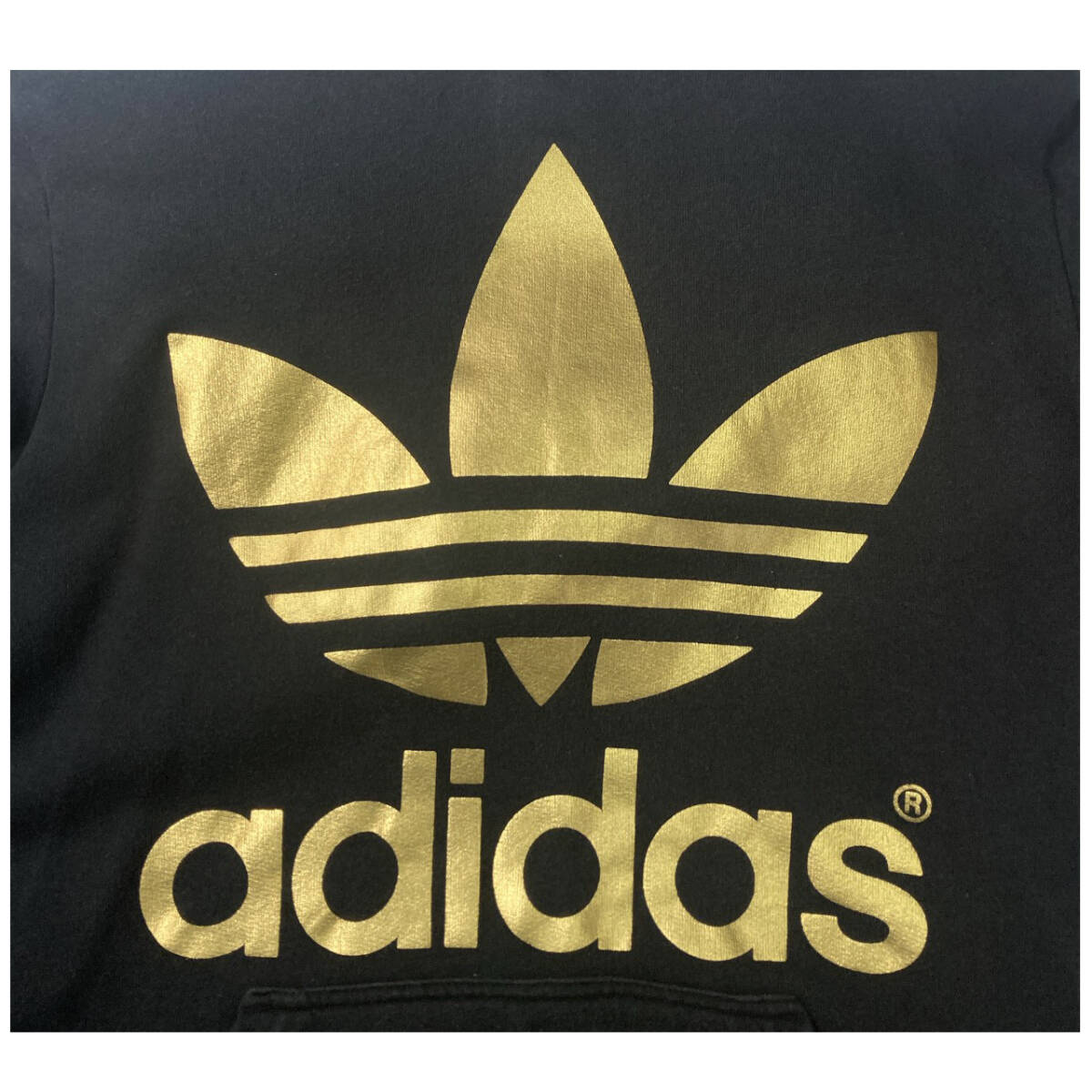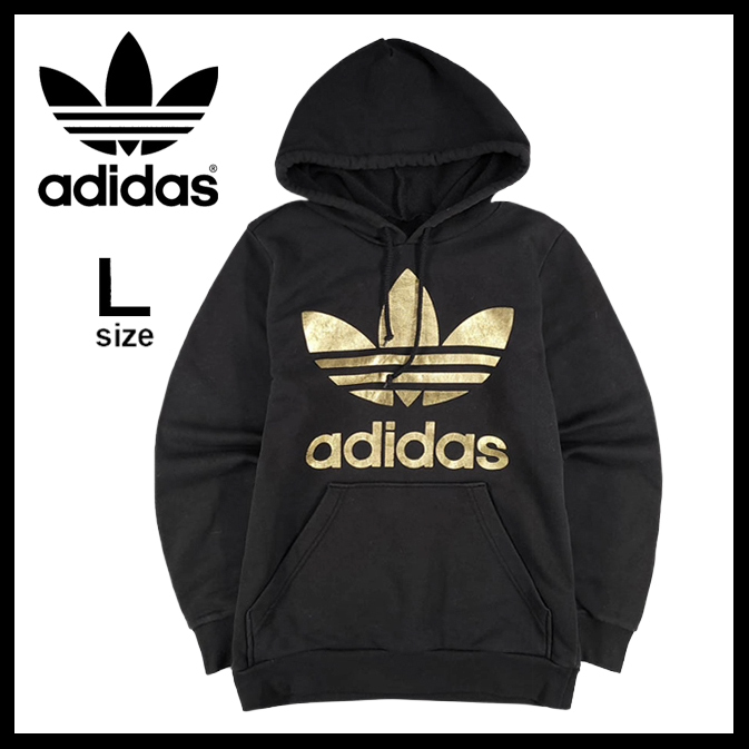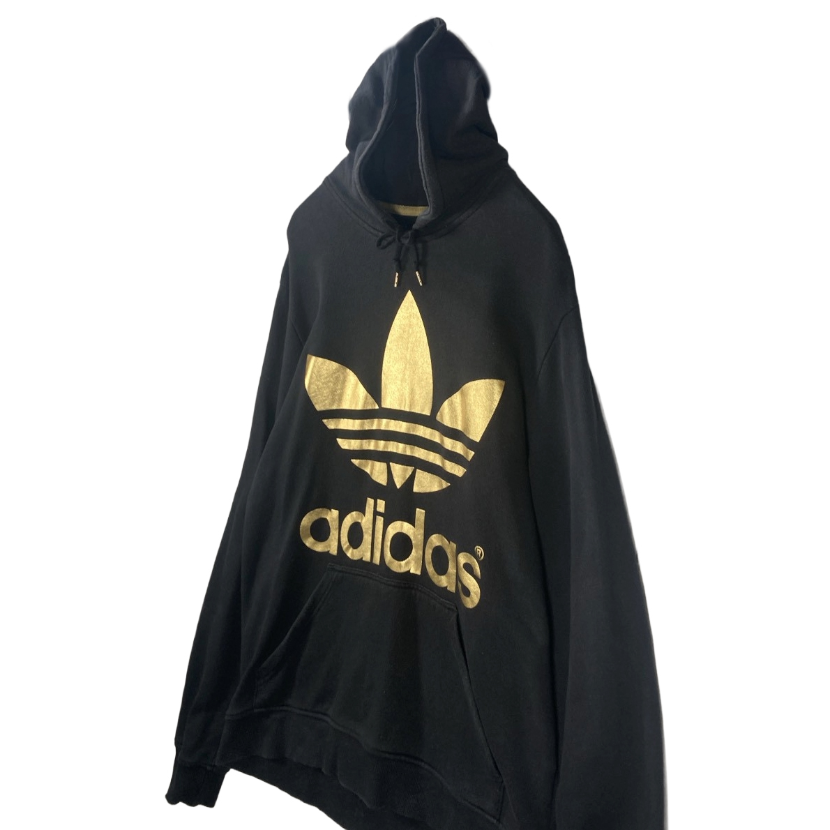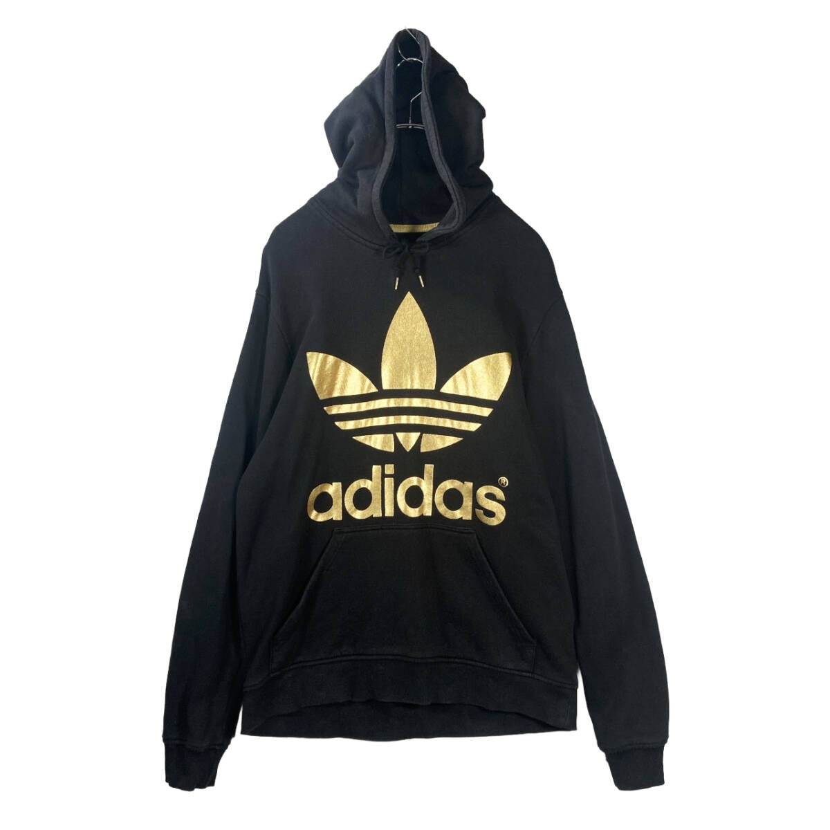 【USED】アディダス adidas パーカー フーディー ゴールド トレフォイルロゴ ビッグプリント 古着 ブラック( L サイズ ) ☆送料無料☆