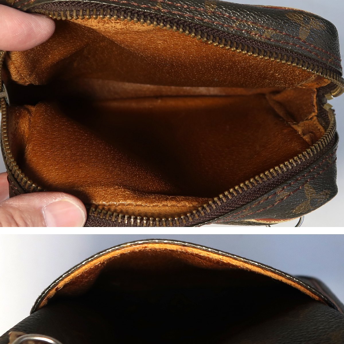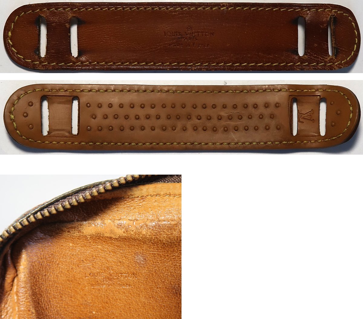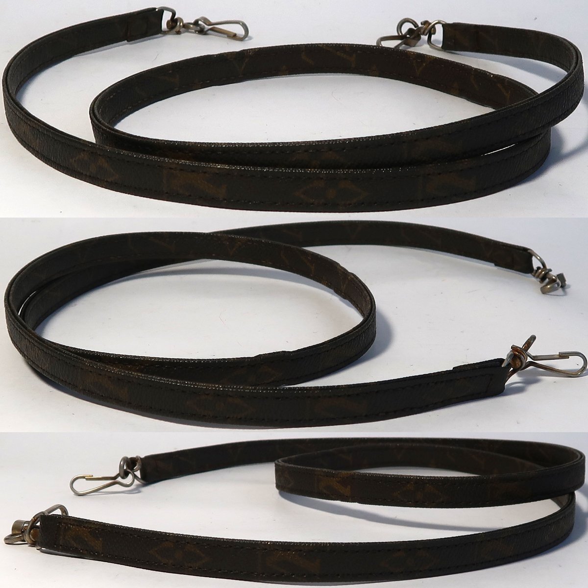 出品は画像のバックのみです。ショルダーストラップの肩パッドはおそらく変更されております。オリジナルは表面がモノグラム柄でした。それがヴィトン製ですが表が革のタイプに交換されています。バックは使用品ですので汚れや擦れはあります。モノグラム地は変色はありますがひどいダメージはないです。部分的に革が使用されておりますが、擦り傷や汚れあります。バックの内側も擦れあります。ショルダーストラップの金具はメッキの色落ちは擦れあります。サイズはW14xH20xD4.5cmくらいです。ショルダーストラップの長さは113cmくらいです。