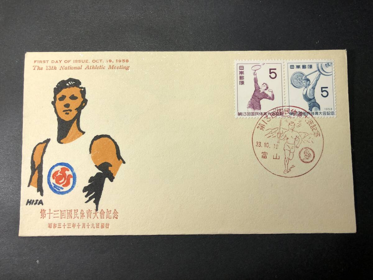 ★FDC 初日カバー★第13回国民体育大会記念 「バトミントン」/「重量挙げ」 2種連刷張 中村浪静堂版 昭和33年発行 Y9704