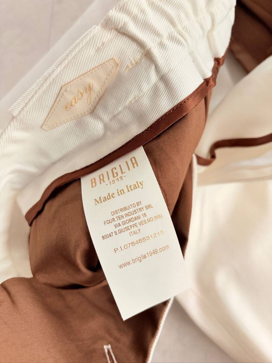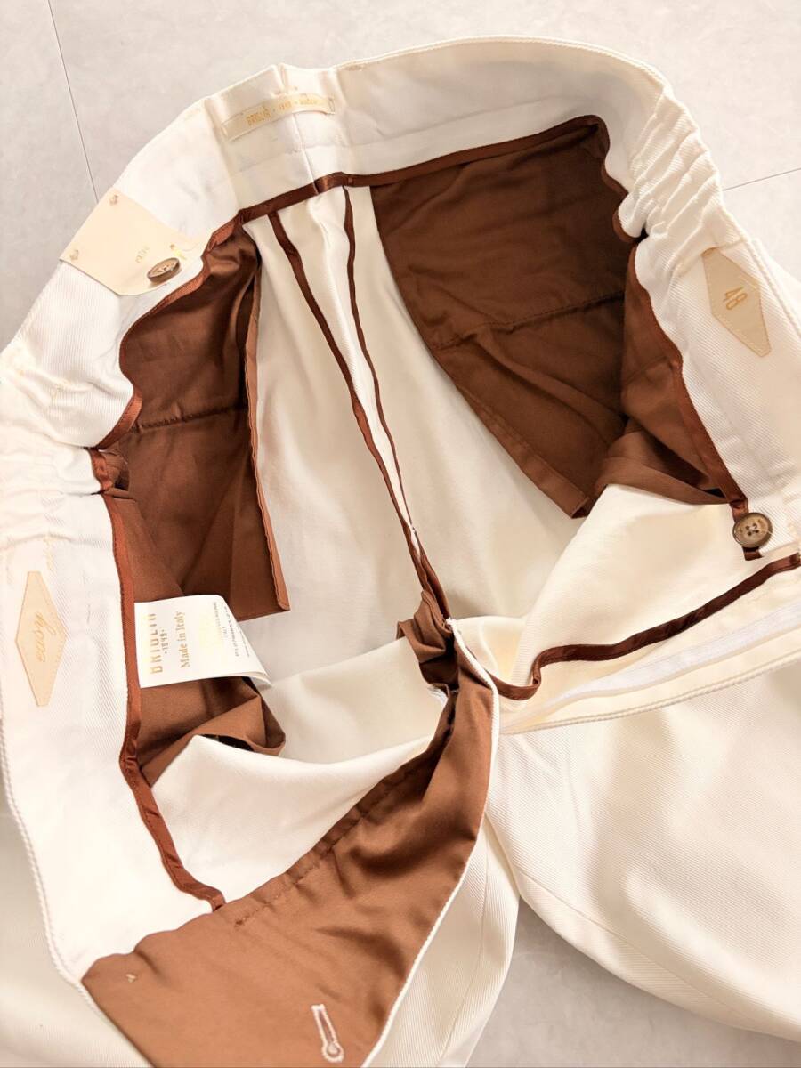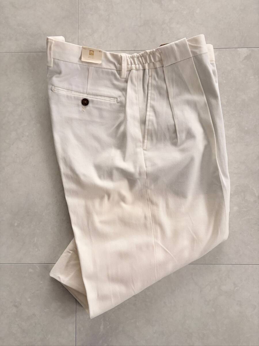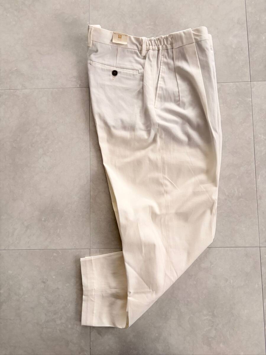 Briglia 1949(ブリリア)は、ナポリのテーラリング文化を背景に生まれたパンツ専業ブランドで、クラシックなトラウザーズの造形美と、モダンなコンフォート性を高次元で融合させることに定評があります。 腰まわりの立体設計、縫い代の処理、ステッチ運動性など、スラックスの仕立てを応用した緻密なパターンワークを得意とし、“美しいシルエットと快適性”の両立をパンツカテゴリーの中で最も洗練された形で提示しているブランドの一つです。 本作は、Brigliaが展開するコンフォートライン「EASY」シリーズのホワイトデニムモデル。 ストレッチ性の高いコットンベース素材を使用し、デニムでありながらスラックスのような軽快さと可動性を実現しています。 ホワイト特有の硬さや無骨さを抑えるため、生地は高密度ながらも糸の撚りを調整し、柔らかなタッチに仕上げられている点が特徴です。伸長回復率も高く、膝抜けや型崩れを抑え、クリーンなラインを長く保ちます。 最大の特徴はウエストのシャーリング仕様で、テーラードパンツのドレッシーな見た目を崩さずに、着脱の容易さと快適性を高めています。 ギャザー分量は抑えめに設計され、腰まわりが膨らみにくいよう計算されているため、タックイン・アウトどちらのスタイルでも美しいバランスが保たれます。シャーリング部分にはドローコードを内蔵し、スポーティさを控えめにした“見せない快適性”を実現。 シルエットはブリリアらしいスリム寄りのモダンフィットで、ホワイトデニムにありがちな膨張感を抑え、脚線をきれいに見せるよう設計されています。 ブランド:BRIGLIA 1949 / ブリリア 1949 素材:コットン98% ポリウレタン2% サイズ:48 ウエスト:86cm 股上:30cm 股下:68cm 渡り幅:35cm 裾幅:17cm ※迅速なお取引を心がけさせていただいております。オークション終了より24時間以内にご連絡をいただけない場合、土日祝日を除き48時間以内にお支払い手続きをいただけない場合は、お取引の意思なしと判断させていただき取引キャンセルとさせていただきます。 万が一上記が不可の場合は事前にご連絡いただくか、入札をお控えいただきますようお願い申し上げます。 ※なるべく現物に近いお色味で撮影するよう心掛けておりますが、閲覧環境の違い等によって違いが出る場合があります。 差し替えトラブルを避ける意味でも上述した旨含め、イメージと違う等での返品は受け付けておりません。 百貨店並みのサービスを求める方や神経質な方の入札はお控えいただきますようお願い申し上げます。 また、差替えやSNS使用後の返品等を防止するためためにも、原則返品には応じられません。 疑問点や心配事等がある場合は入札前に質問欄にてお問い合わせください。 ※当方が出品するすべての商品は間違いなく本物ブランド品となりますので、安心してオークションにご参加ください。 万が一、第三者等により偽物と判断された場合、商品の返品、お支払いただきました全額を返金をいたします。 |