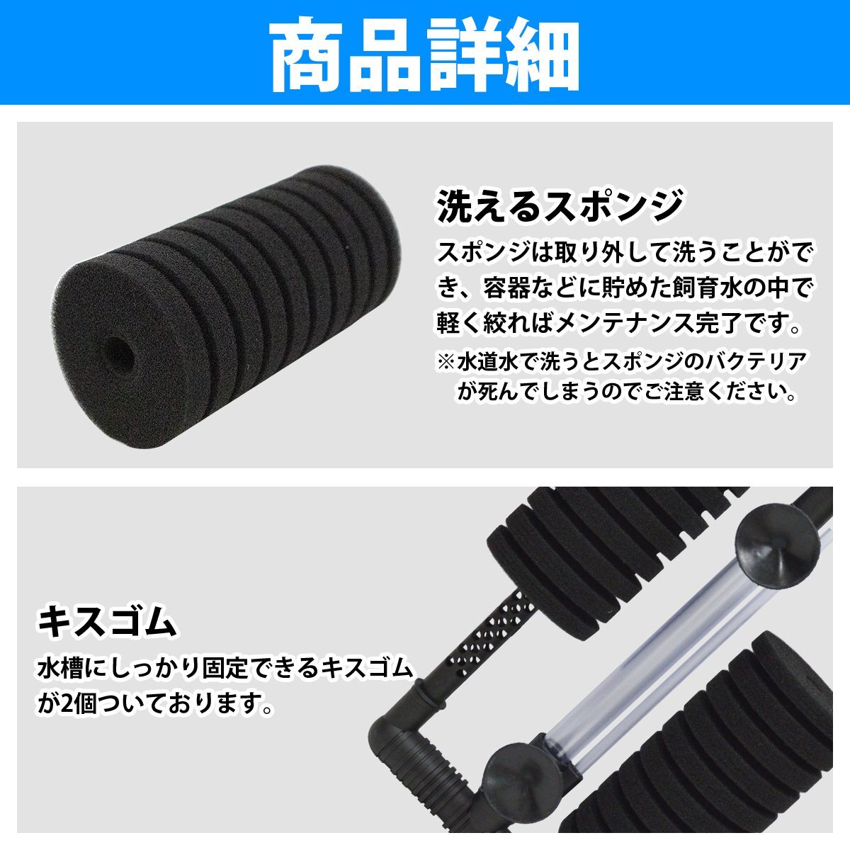吸水口がスポンジで覆われており、魚を吸い込まないため稚魚水槽やグッピー、ベタなどの飼育にも適しています。