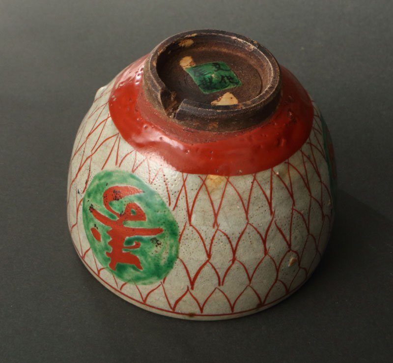 委託HK◇青木木米 赤絵福禄寿茶碗 富岡鉄斎識 ※仕覆添え(茶道具 陶磁器 陶芸 抹茶碗 京焼 色絵 赤絵 聾米 九々鱗 鉄人 鉄史 古美術 )