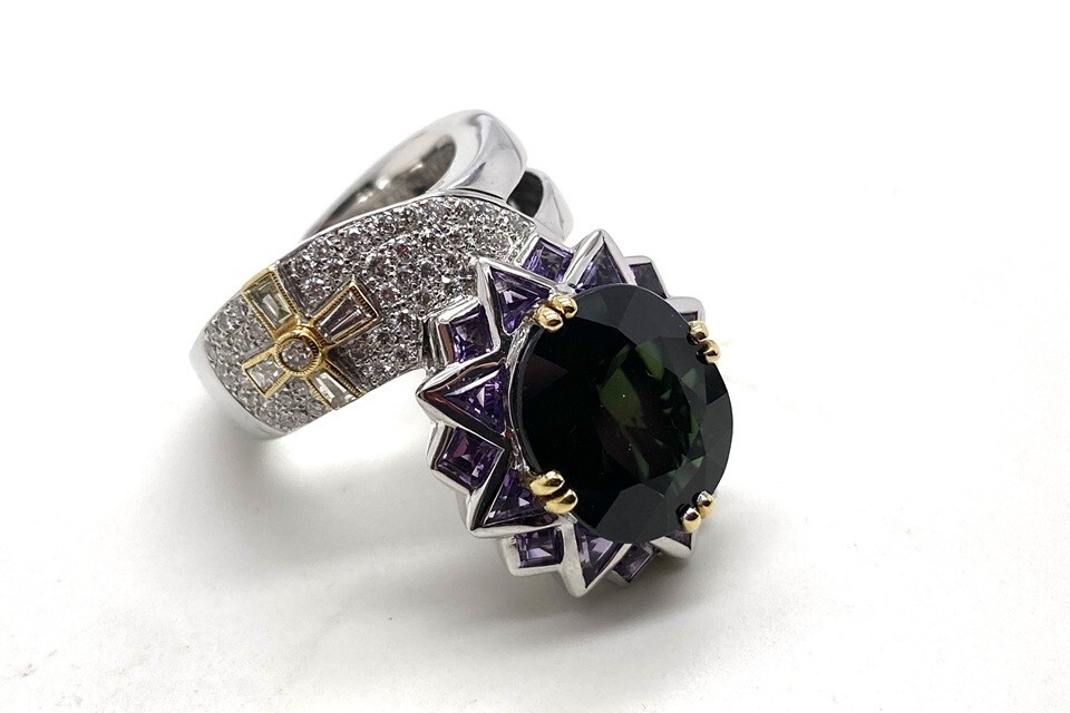 | 解説 | 宝石の個性を活かした斬新なデザインと丁寧な作品作りで知られる、日本屈指のハイジュエラー JEWEL STUDIO。深海の底を思わせる程の深いグリーンが、ヨーロッパ貴族の紋章を象ったような意匠に、風格ある空気を漂わせます。豊かな地金の感触が心地よく、装着感も流石! |