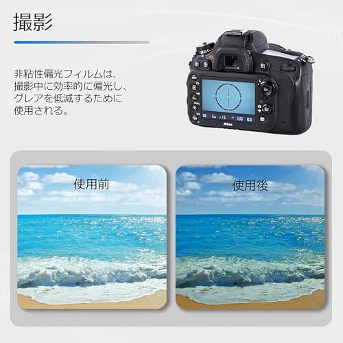 使用方法:偏光フィルターの埃を取り除いた後、保護フィルムをはがし、角度を調整して使用します。