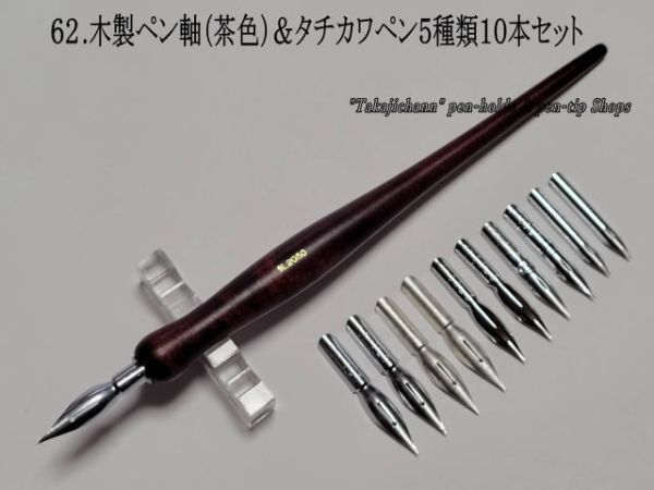 62.木製ペン軸(茶色)&タチカワ替えペン先5種類10本セット 筆圧が強いと感じるタイプの人にお薦め