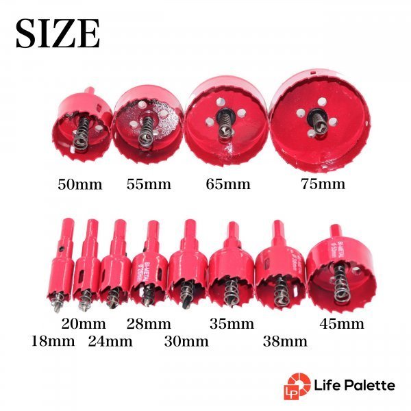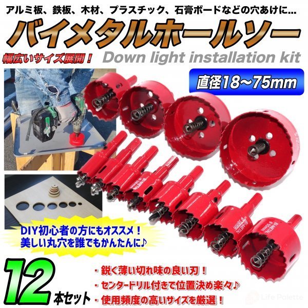 | バイメタルホールソー 直径18~75mm 木工 穴開け 穴あけ 工具ドリルビット 鉄工キリ 電動ドリル 配管 まとめ買い セット ライフパレット DJ5612 新品 送料 全国一律1500円 バイメタルホールソー アルミ板、鉄板、木材、プラスチック、石膏ボードなどの穴あけに 使用頻度の高いものを厳選! お得なバイメタルホールソー12点セットです。 アルミ板、鉄板、木材、プラスチック、石膏ボードなどの穴あけにお使いいただけます。 センタードリル、スプリング付きで掘削などにも適しています。 薄刃設計により切削抵抗が少なく、速い穴あけが可能です。 支払詳細 セット内容【バイメタルホールソー 12本】 ヘッド直径18~75mm 12本セット 18mm 20mm 24mm 28mm 30mm 35mm 38mm 45mm 50mm 55mm 65mm 75mm 材質:HSS センタードリル スプリング付き 軸形:写真参照 (3本爪チャック式用 6.35ミリ六角軸には使用不可) 適用機器:回転専用ドリル、ボール盤 電動ドリル等 (チャック10mm~13mm汎用型) 適用材質:アルミ板(3mm以下)、鉄板(3mm以下)、木材、プラスチック、石膏ボード等 【ホールソー使用動画】 その他ホールソーセットはこちらから♪ 【使用上の注意】 部材に対し垂直に使用してください。途中からドリルを傾けたりしないで下さい。 作業時はゴーグルやマスク等の保護具を装着してください。 作業時はホールソー本体が熱を持っており、火傷の恐れがありますので素手で触らないようにしてください。 | |||