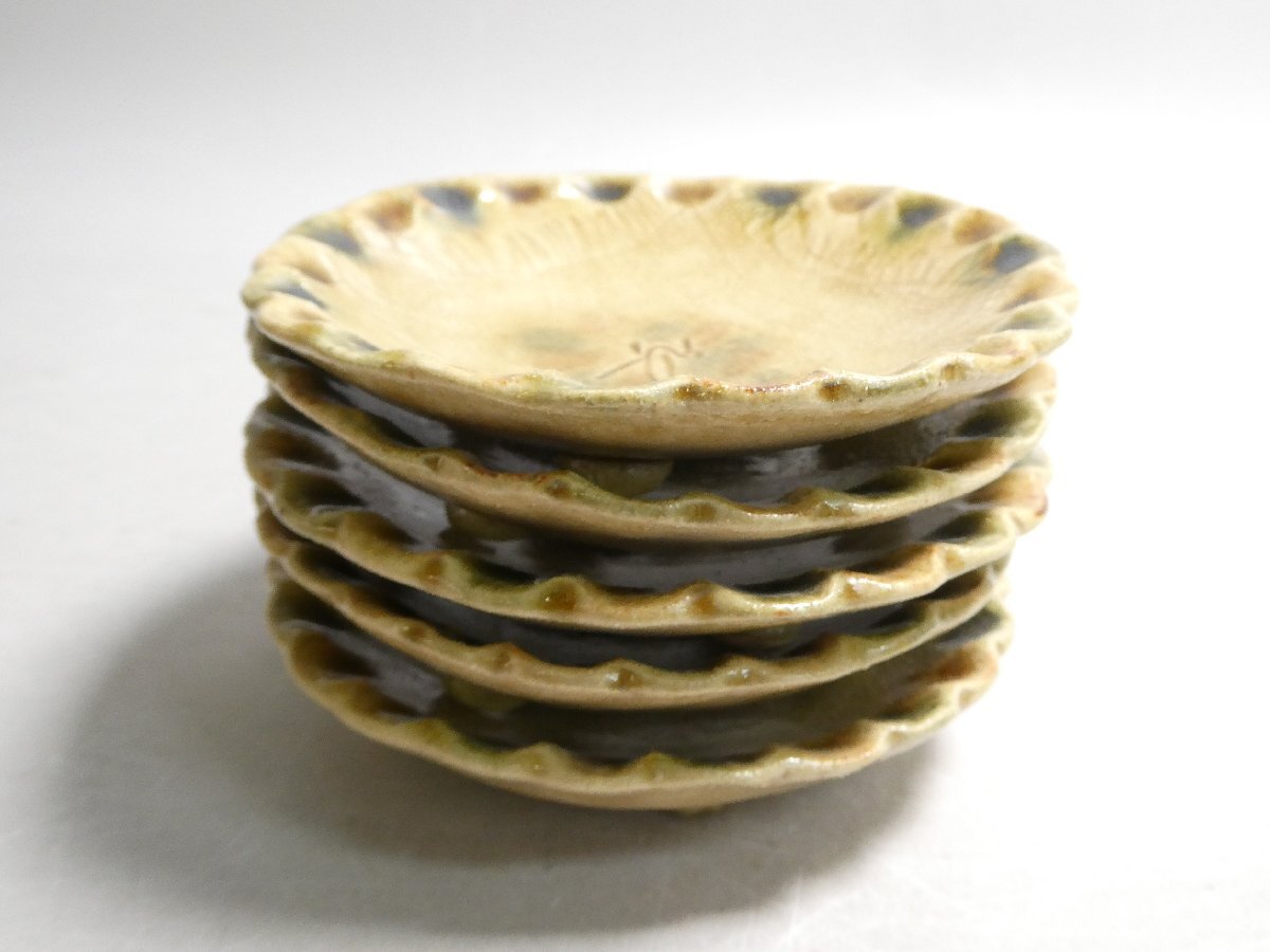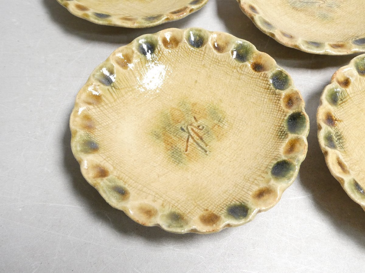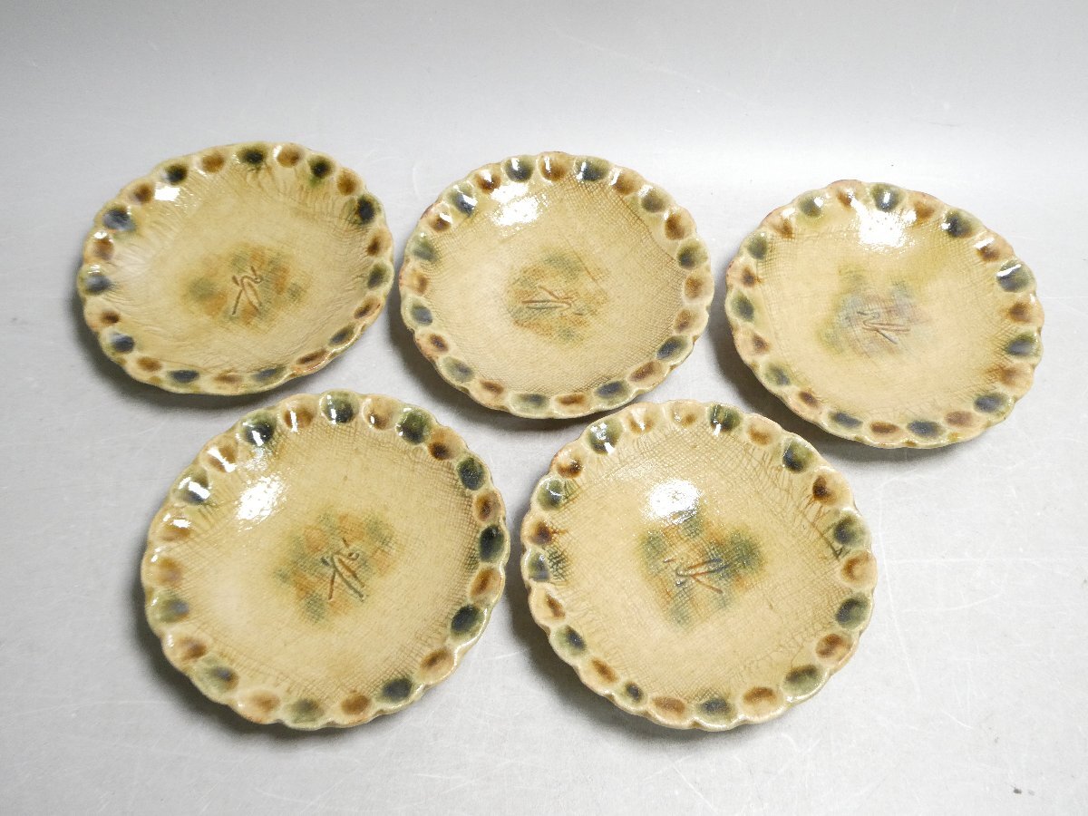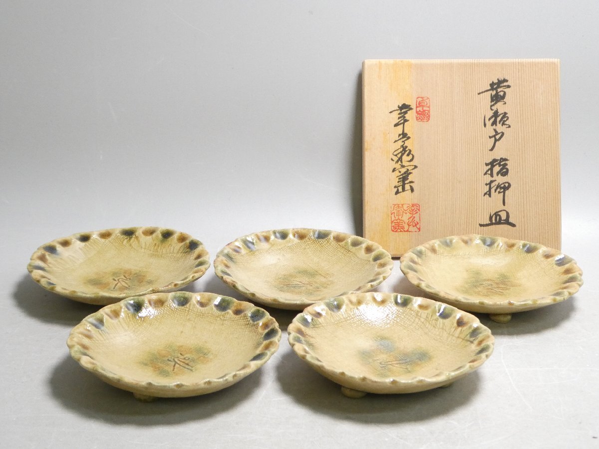 120905 人間国宝 加藤卓男 幸兵衛窯 黄瀬戸 指押皿 五客 共箱