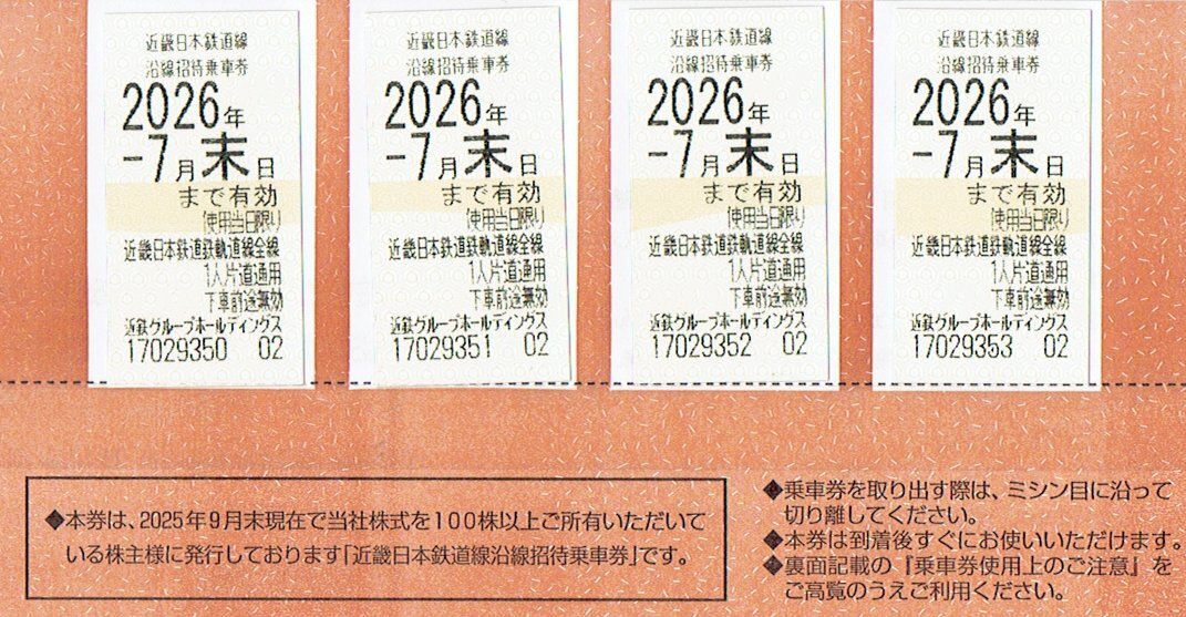 近鉄 株主優待 乗車券 4枚 2026年7月末まで