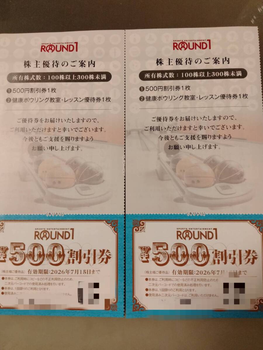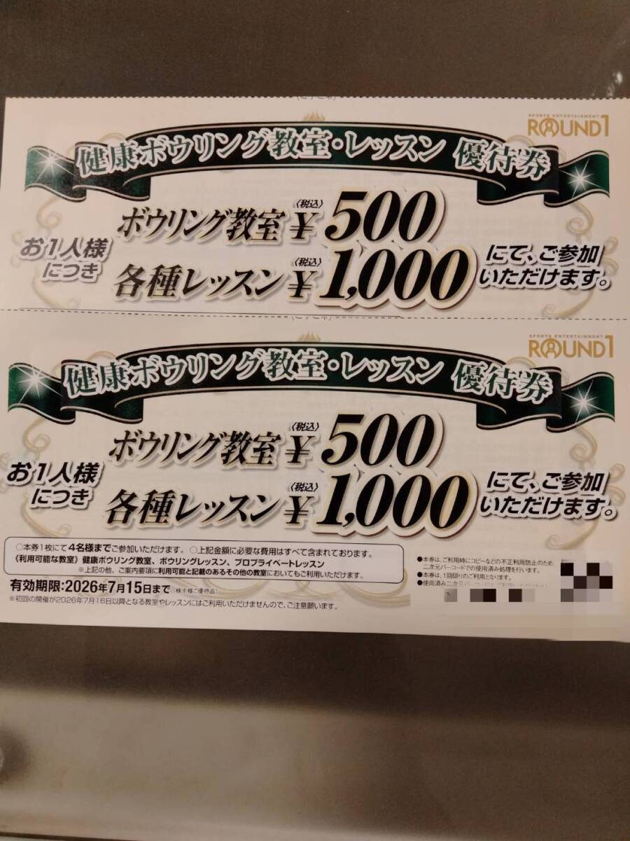 ★ラウンドワン 株主優待 500円割引券×2枚・健康ボウリング教室,レッスン優待券×2枚