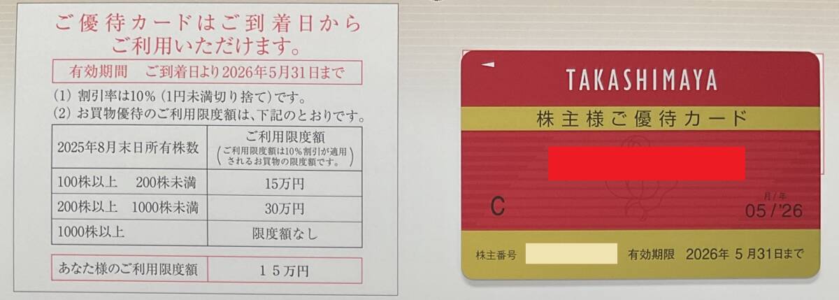 高島屋 株主優待カード 10%割引き(女性名義・限度額15万)になります。