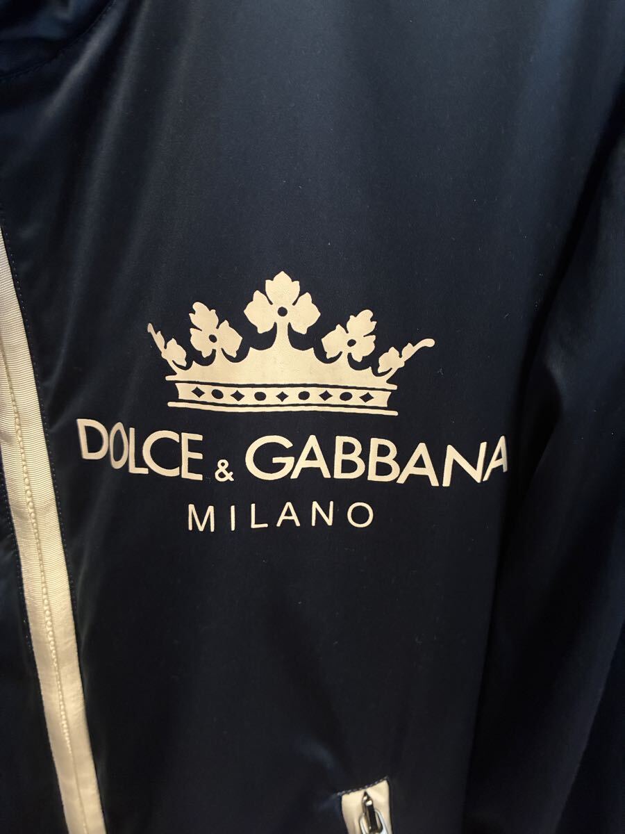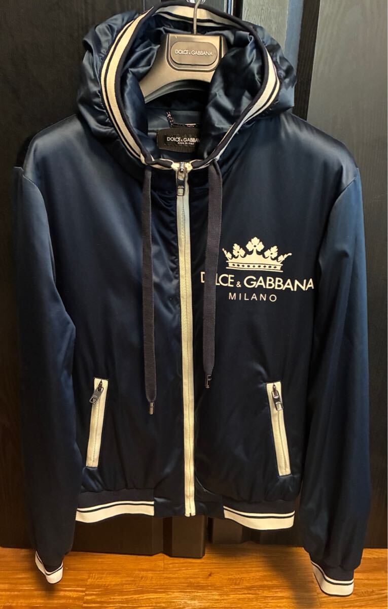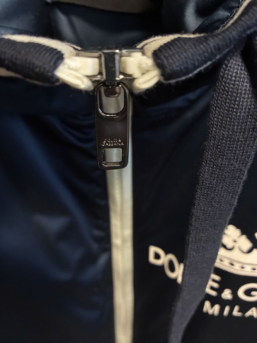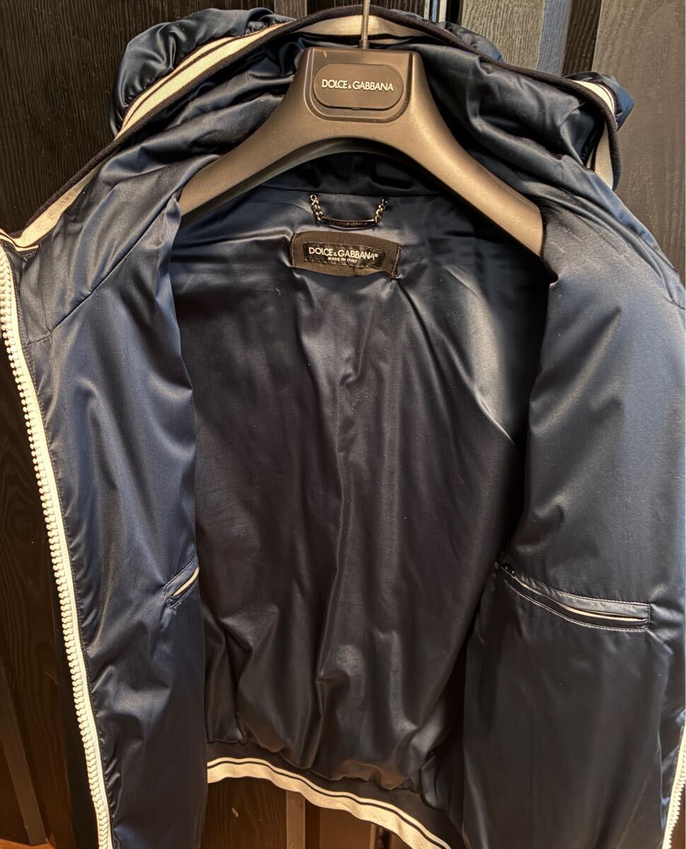ネイビーのフード付きジャケット、Dolce & Gabbanaのロゴ入り。
