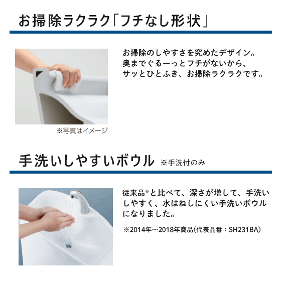・ 従来品と比べて深さが増して手洗しやすく、水はねしにくい手洗ボウルになりました。