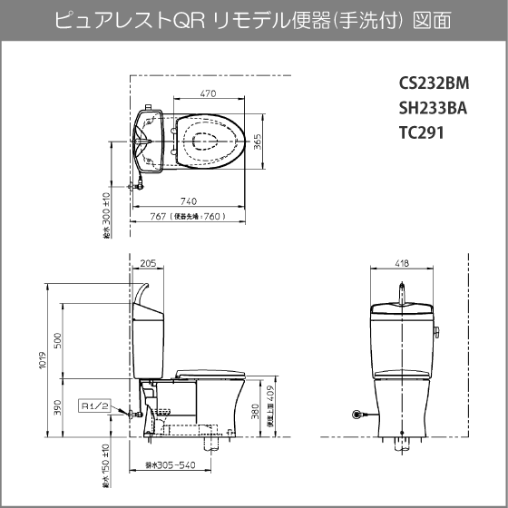 便器 ピュアレストQR リモデルタイプ(手洗付) 普通便座セット CS232BM,SH233BA,TC291 TOTO リフォーム用便器 ★