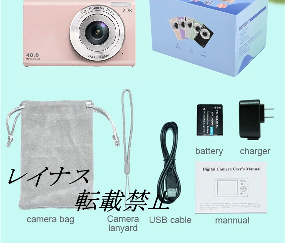パッケージ内容: USBケーブル、充電器、リチウム電池、ストラップ、レンズクリーニングクロス