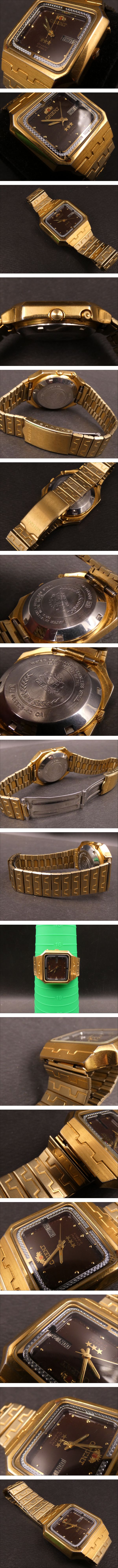 | オリエントの自動巻き腕時計「スリースターCrystal 469ED5-40CA」動作品です。 ・個人宅で長期間放置されていた時計です。 ・ケースサイズ約35.5×35mm、厚さ11.5mm、ラグ幅20mm、現状腕回り約175mm。総重量85.9g。※素人採寸につき誤差はご容赦願います。 ・現在振動により稼働しています。平置き数時間の確認ですが、大きな後れや進みはありませんでした。ケース上ボタンプッシュによる曜日送り、リューズ1段引きによる日付送り、2段引きによる時刻合わせ、デイデイト連動は確認できました。但しメンテナンス歴不明の古い時計ですので、要修理品とお考え下さい。 ・破損や大きなキズはありませんが、使用汚れ、小キズ、メッキ変色のある時計です。また、ベルトの一部に接続緩みがあります。 ・付属品無し。 ・画像でご判断いただきご検討をお願いいたします。 | ||