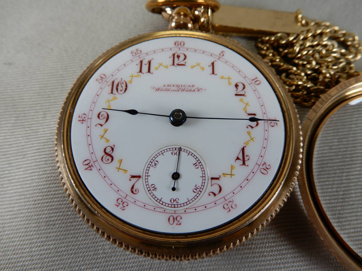 1894年製◆WALTHAM/ウォルサム・ファンシー文字盤・彫金・金張りケース◆機械式/手巻き 18S 大型懐中時計 Modl:1883・鎖付き