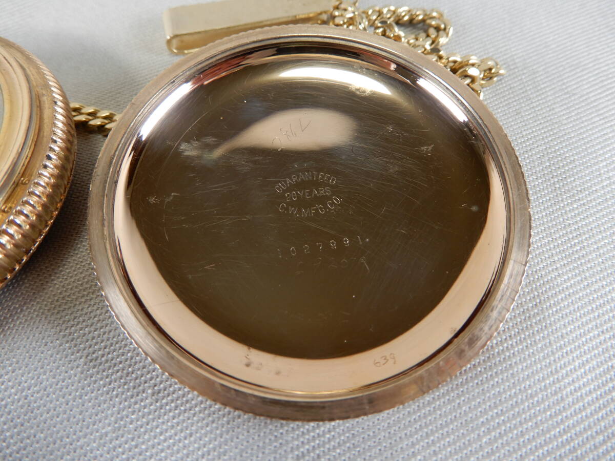 ケース:金張り(20 Years)ケースの風防と裏蓋ともにねじ込み式で、しっかり閉まります。彫金が施された金張り製ケースは大きなキズや凹みもなくまた金張りの剥げも少なく相対的には綺麗なケースだと思います。ガラス風防には、気になるような欠けもなく奇麗な状態です。ただし、いずれも個人的な主観になりますので、あくまで写真優先とし、写真でのご確認をお願いいたします。裏蓋の内側に「GURANTEED 20 YEARS C.W.C.MF’G.Co. 1027991」と本体枠に「991」の刻印があり、同じセットのケースだと思います。