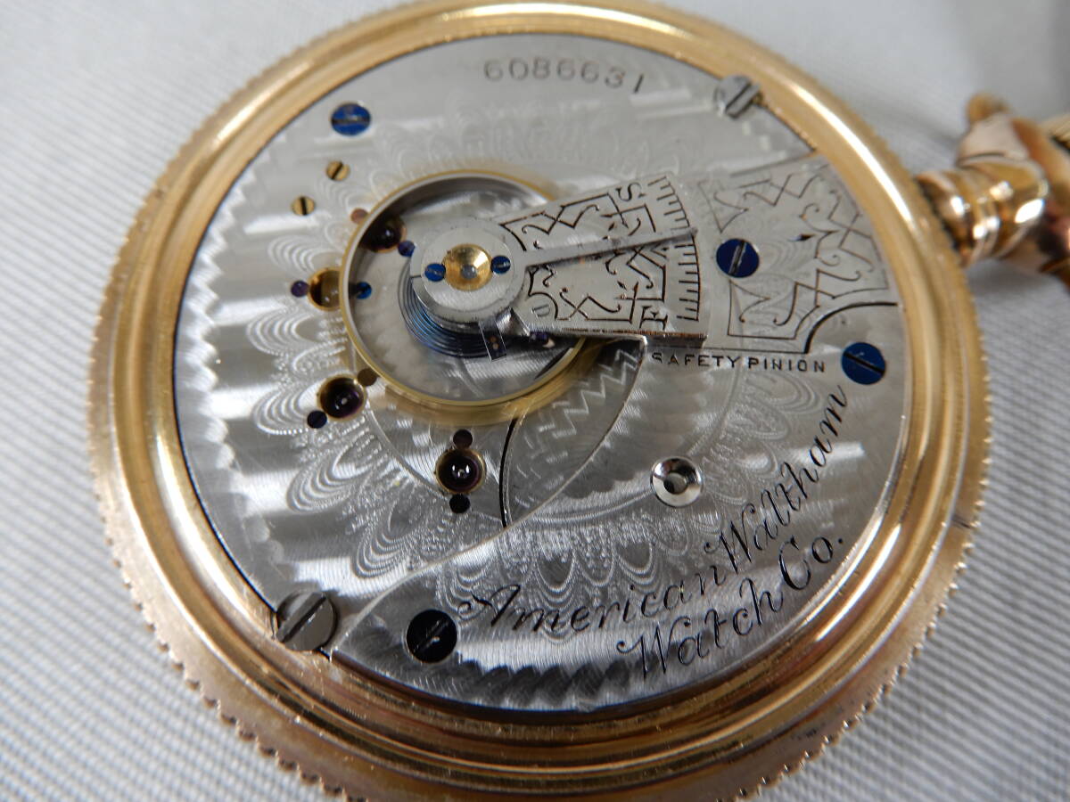 ムーブメント:1883モデルの11石出テンプ仕様のムーブメントは、経年による劣化もあまり見られず、大変美しく銀色に輝いています。そのムーブメントにはAmerican Waltham Watch Co.  6086631  SAFETY PINIONと刻印され、そこには細かな装飾模様が彫られていて、見ていても飽きないようです。