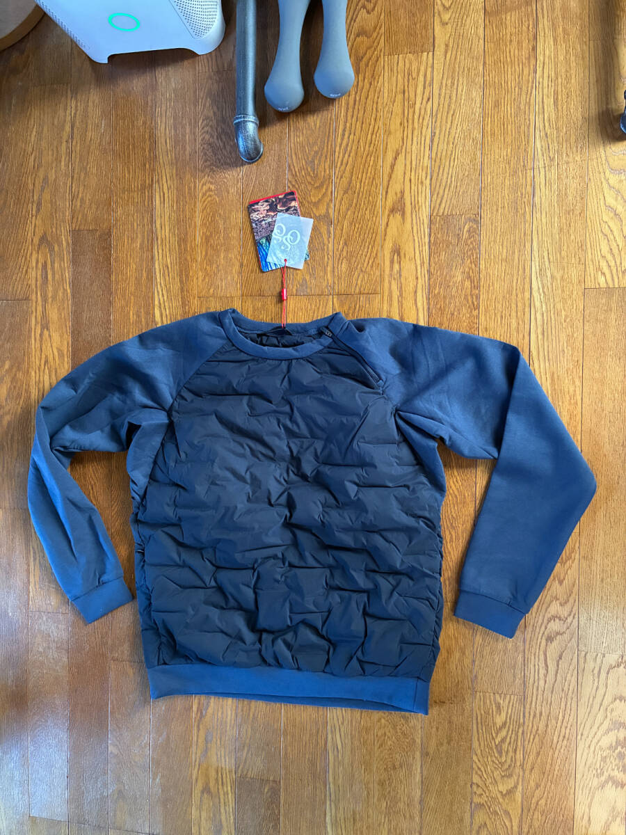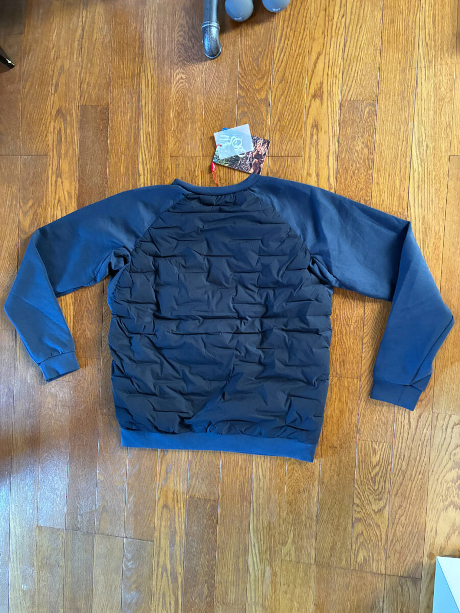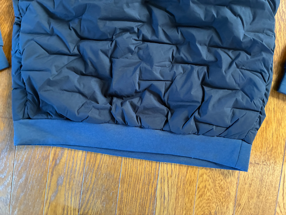 アウターシェルのダウン部分以外は、伸縮性があるスパンデックス素材で、中綿は極細中空糸の人口ダウンです。