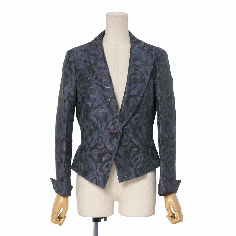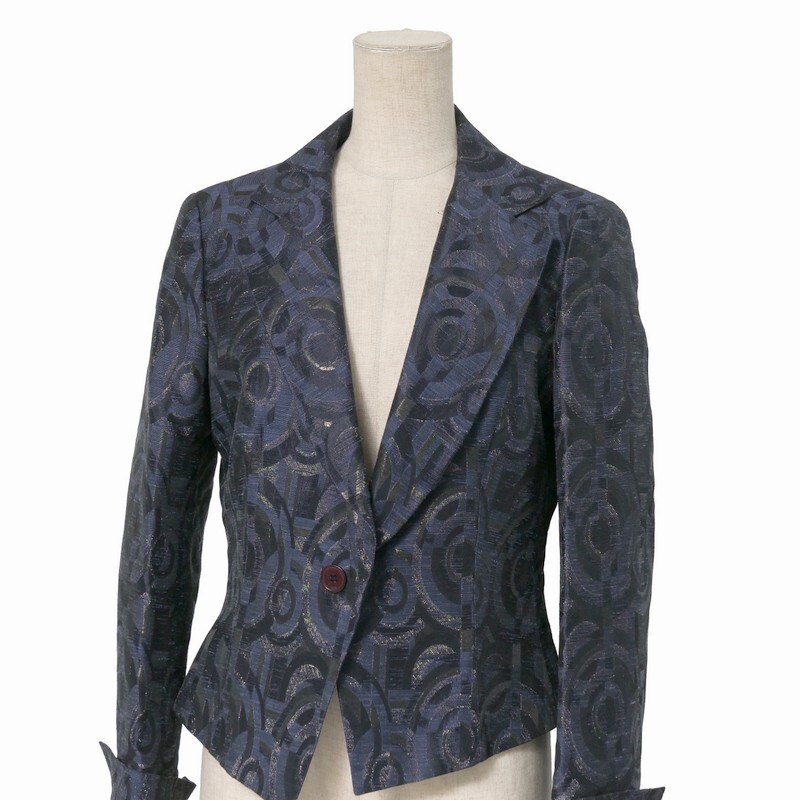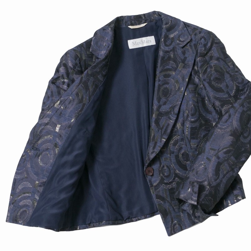 | MI4468=イタリア製*マックスマーラ/MaxMara*白タグ*ラメ感*総柄*ショールカラー*リネン混*ショート丈ジャケット*サイズIJ42*ネイビー系 | |||