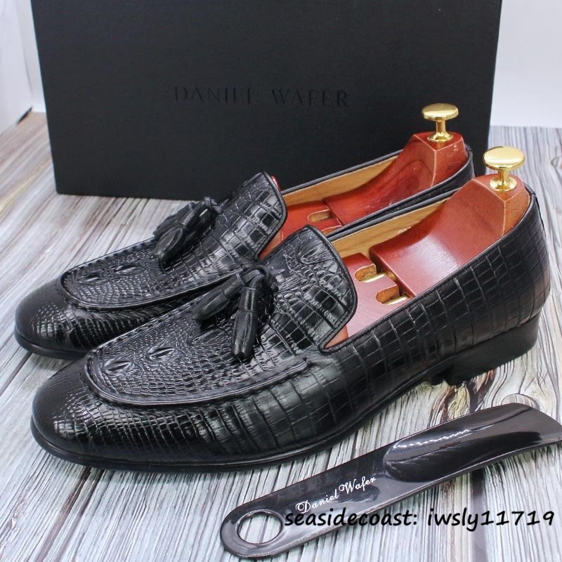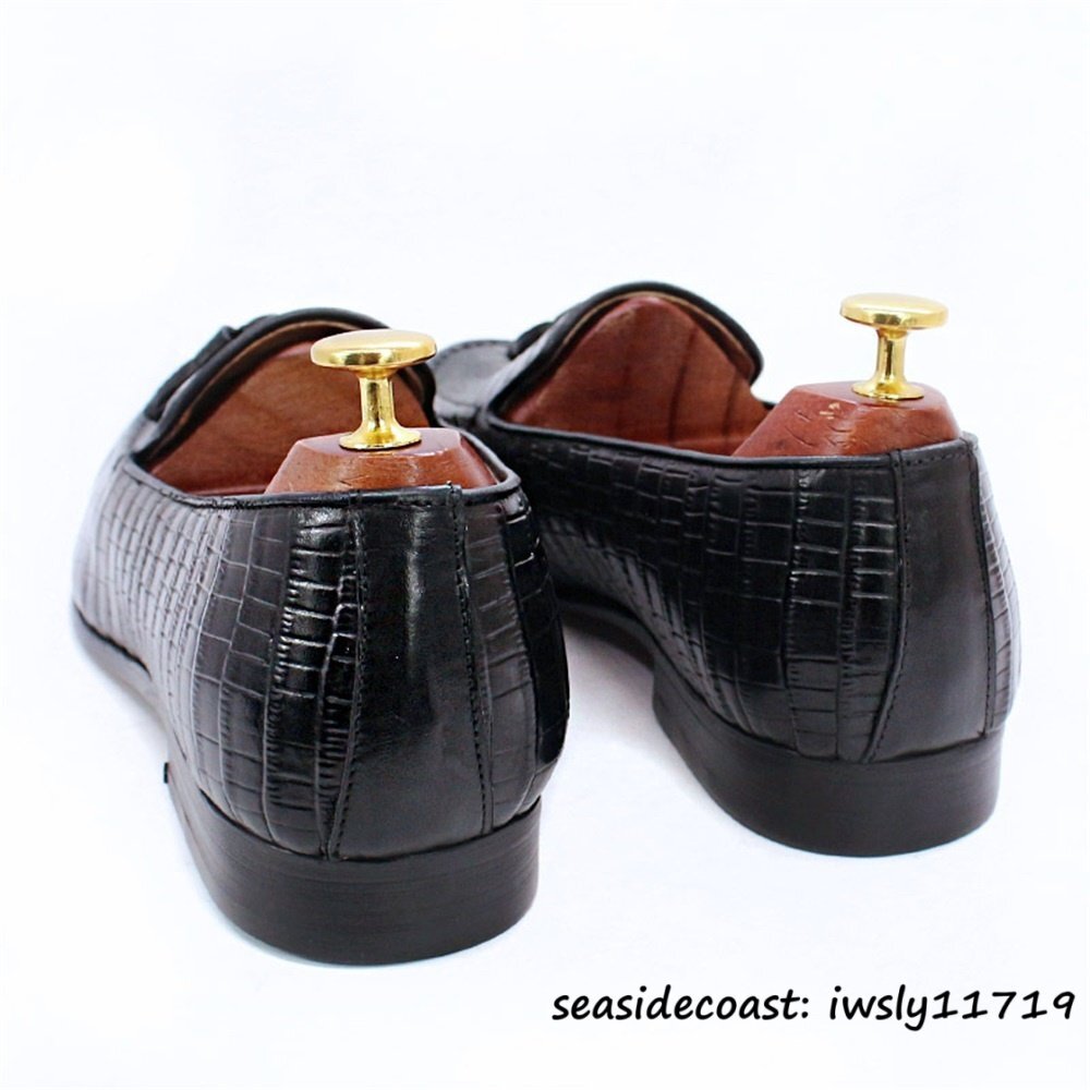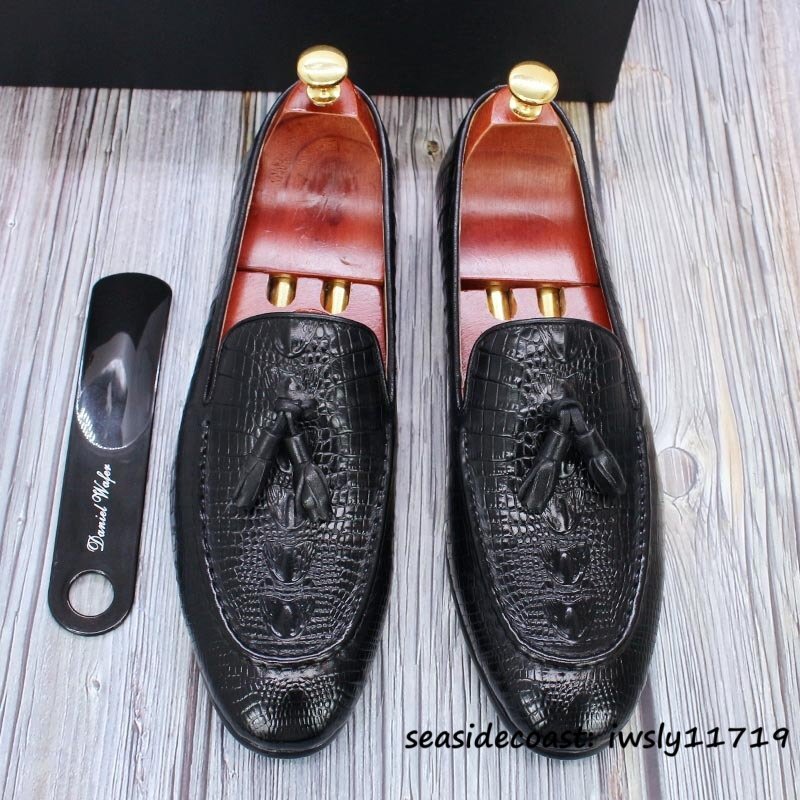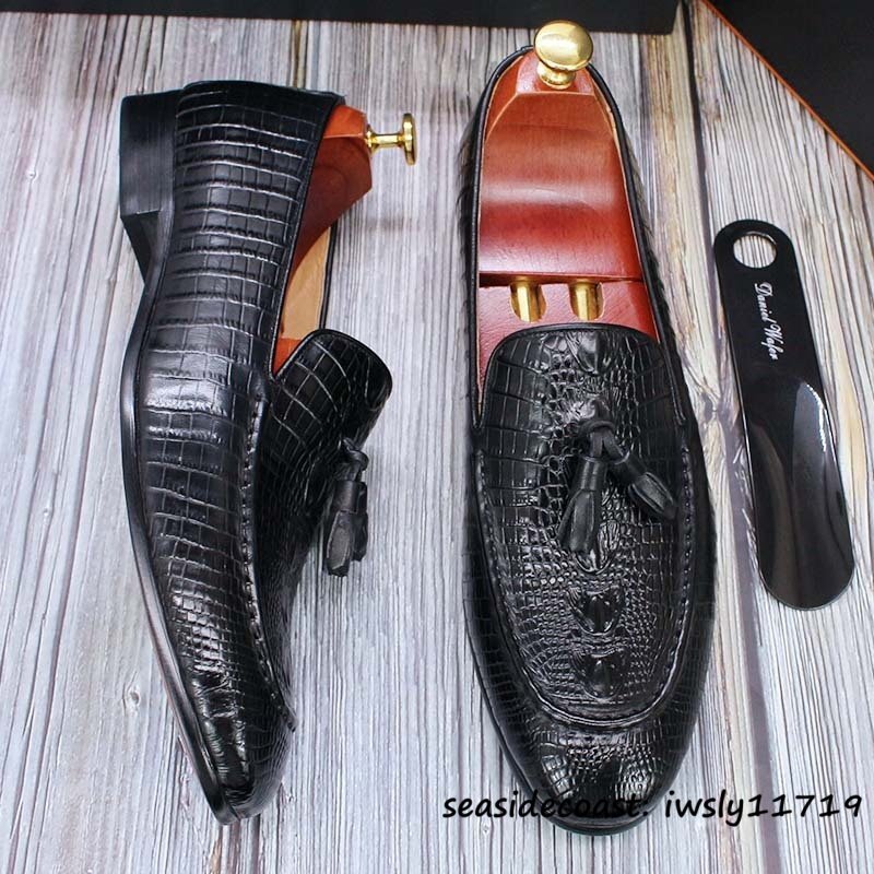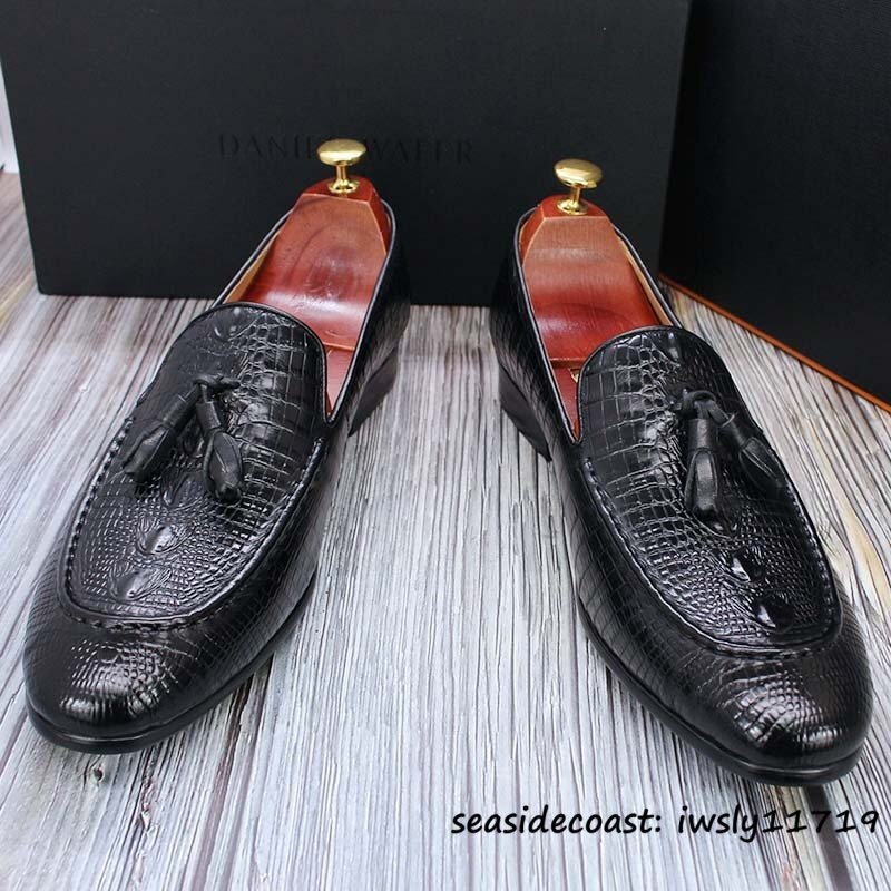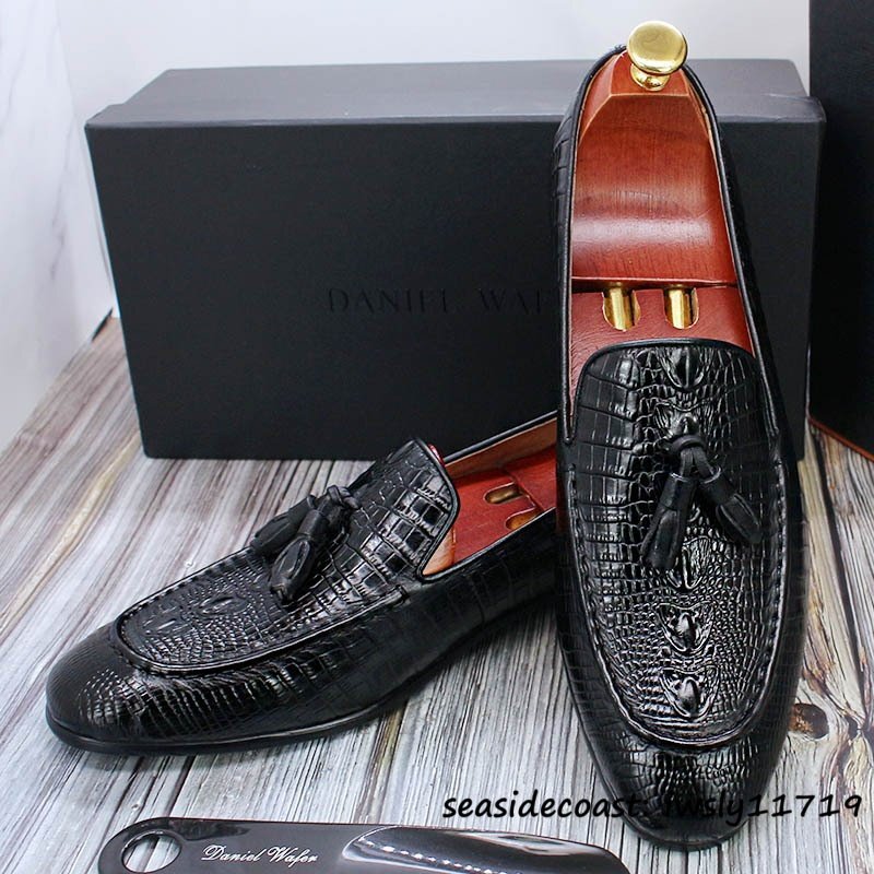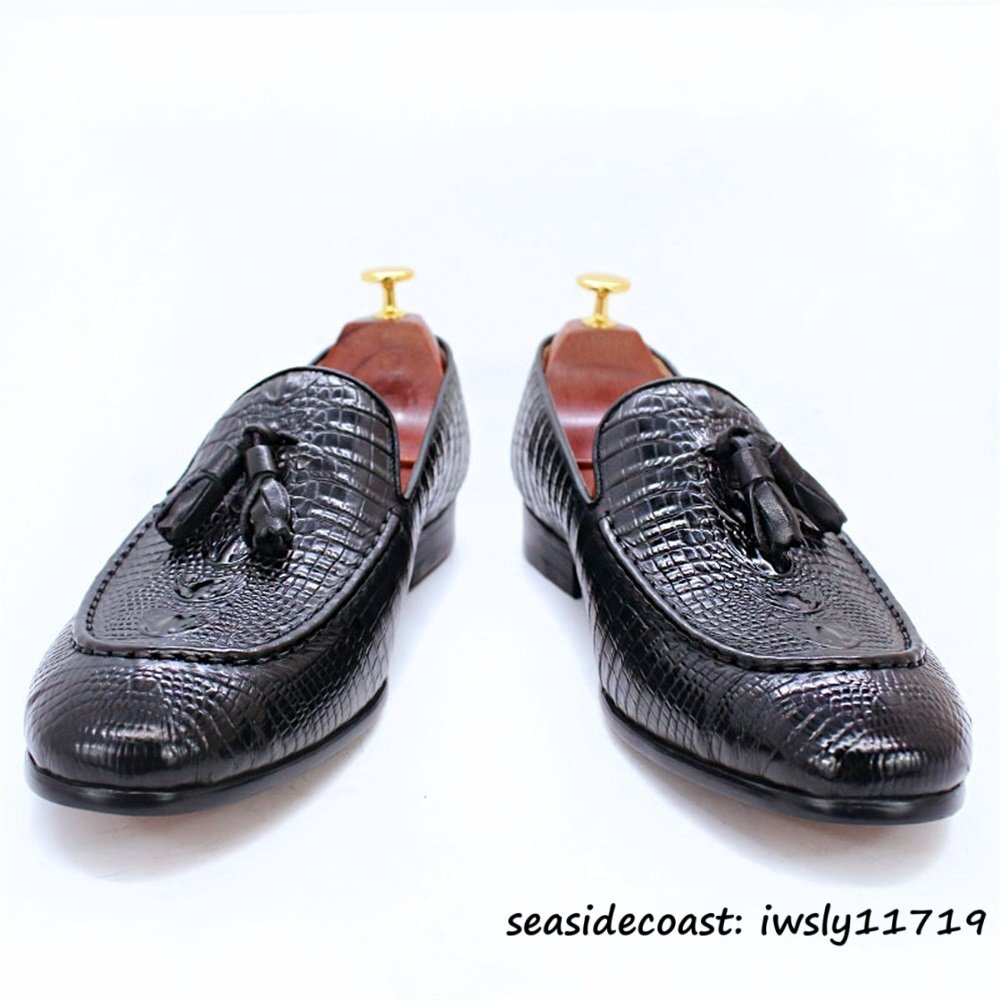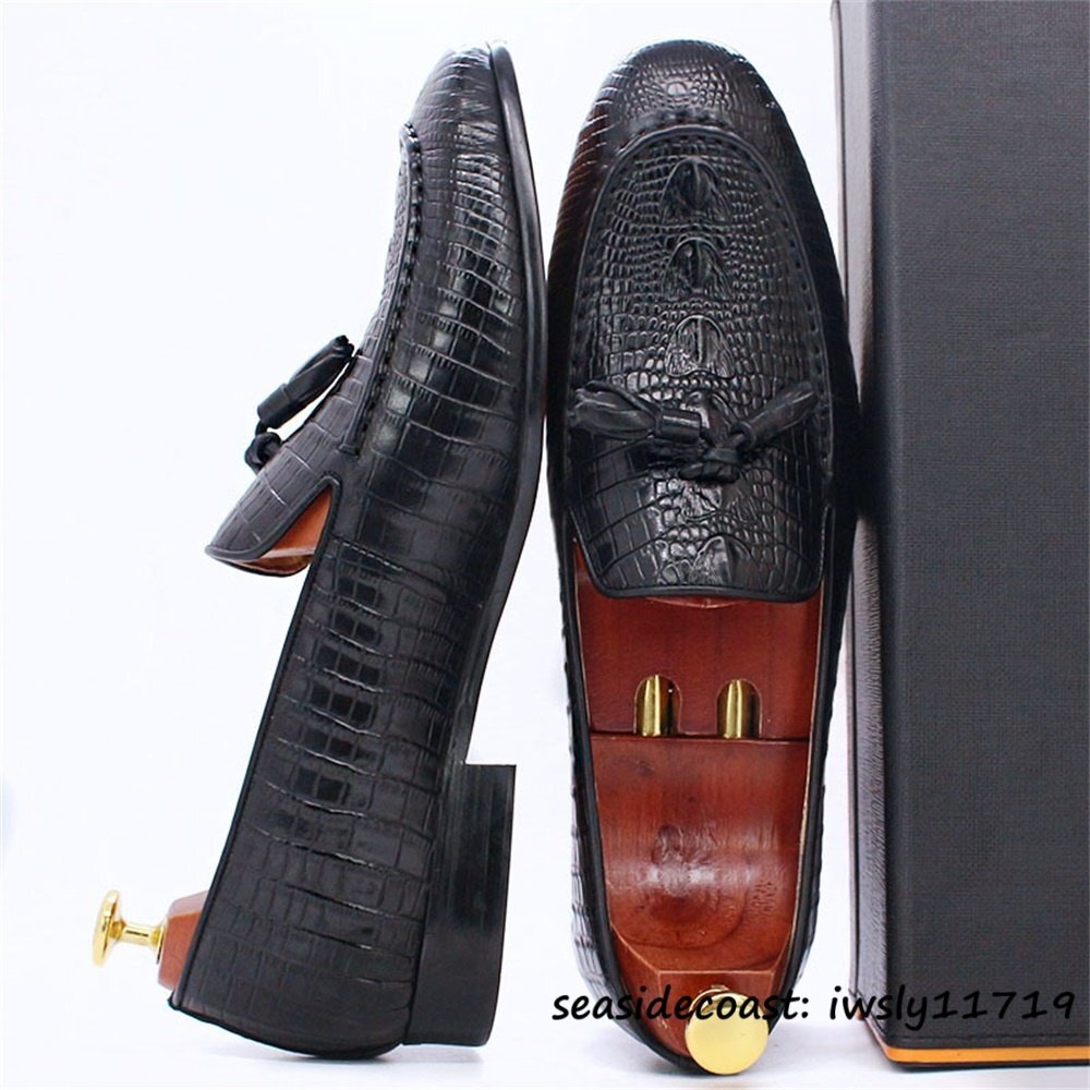 定価10万超★最高級 メンズシューズ 鰐柄 職人手作り ビジネスシューズ 本革レザーシューズ タッセルローファー 牛革 革靴 ブラック 25.0cm
