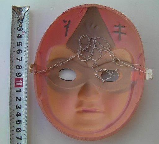 取り扱っていますお面は基本的に遊ばれた物ではなく当時の未使用デッドストックで、色褪せ、割れ、凹みなく概ね美品ですが、ゴム紐は経年による不可効力で自然に伸びています。
