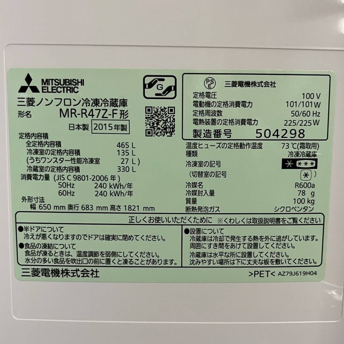 【MITSUBISHI】 三菱 5ドア ノンフロン冷凍冷蔵庫 MR-R47Z-F 465L 2015年製 動作確認済み キッチン家電 A1008