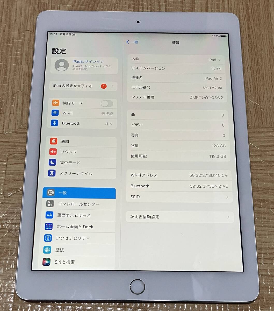 Apple iPad Air2 A1566 Wi-Fiモデル 128GB シルバー (MGTY2J/A)【アクティベーションロック解除済】