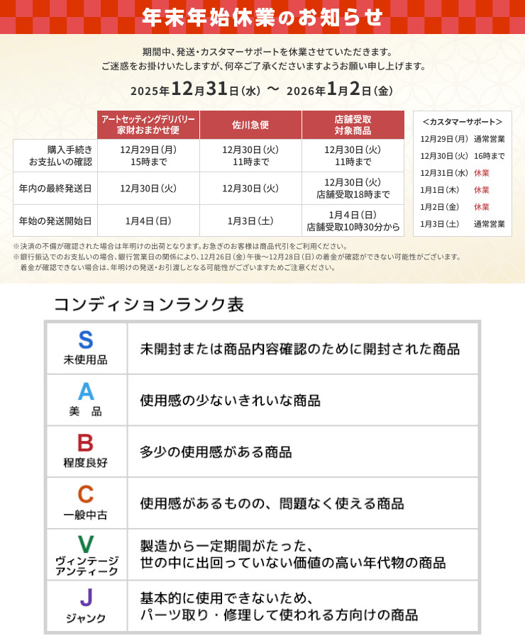 ※ご落札より5日以内に取引ナビでの購入手続きをお済ませください。 ※期限内にお手続きいただけない場合は自動的に取引キャンセルとなりますのでご注意下さい。 ※システムの都合で送料が0円表記の場合がありますが、配送品は商品説明記載の送料が発生します。 送料0円でご決済いただいた場合は、取引メッセージにてお支払いについてご連絡させていただきます。 【発送状況について】 購入手続き・お支払いが確認できましたら、1~2日以内を目途に発送します。 発送状況については取引ナビ上で通知いたしますので取引ナビをご確認ください。 発送にあたり確認事項がございましたら、発送を控え、取引メッセージからご連絡いたします。 【インボイス対応書類について】 適格請求書発行事業者登録番号を記載した領収書でのご対応となります。 ■「クレジットカード決済」「PayPay残高等」「PayPayクレジット」にてお支払いされる場合 発送完了翌日よりお客様ご自身にて取引ナビ上より発行をお願いいたします。 領収書の発行方法の詳細やまとめて購入手続きの場合の領収書についてはこちらをご確認ください。 ■「コンビニ決済」「銀行振込(三井住友銀行 / PayPay銀行)」「ショッピングローン」にてお支払いされる場合 取引ナビ上での発行は不可のため、当店にて発行し、商品に同梱いたします。 ご希望の場合は、ご購入手続きの際に領収書欄を「必要」にしてお手続きください。 ※宛名・但書のご指定は「ストアへの要望」欄へご記載ください。 ■「商品代引」にてお支払いされる場合 配送伝票の控えに代えさせていただきます。 【受け取り連絡について】 当店はストアとなりますため「受け取り連絡」は不要です。 【評価について】 多くのお客様より評価不要のご連絡をいただいているためおつけしておりません。 評価をご希望のお客様は、購入手続き後に取引メッセージよりご要望ください。 |