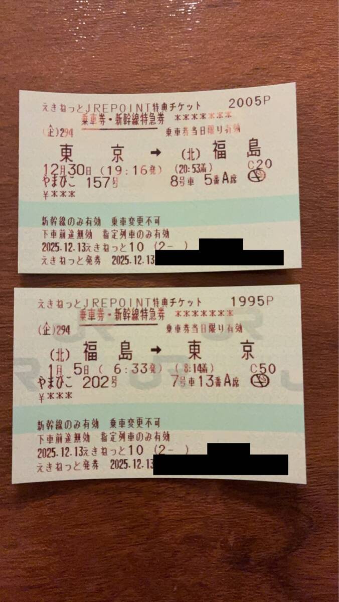 【送料無料・即決あり】東京⇔福島 新幹線往復指定席 東京から往路12/29→復路1/5着 JR東日本 JRE POINT特典チケット。