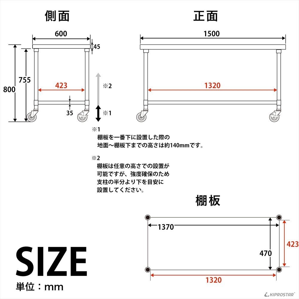 | 即納 業務用ステンレス作業台 キャスター付き 調理台 1500×600×800 板厚1.2mmモデル |