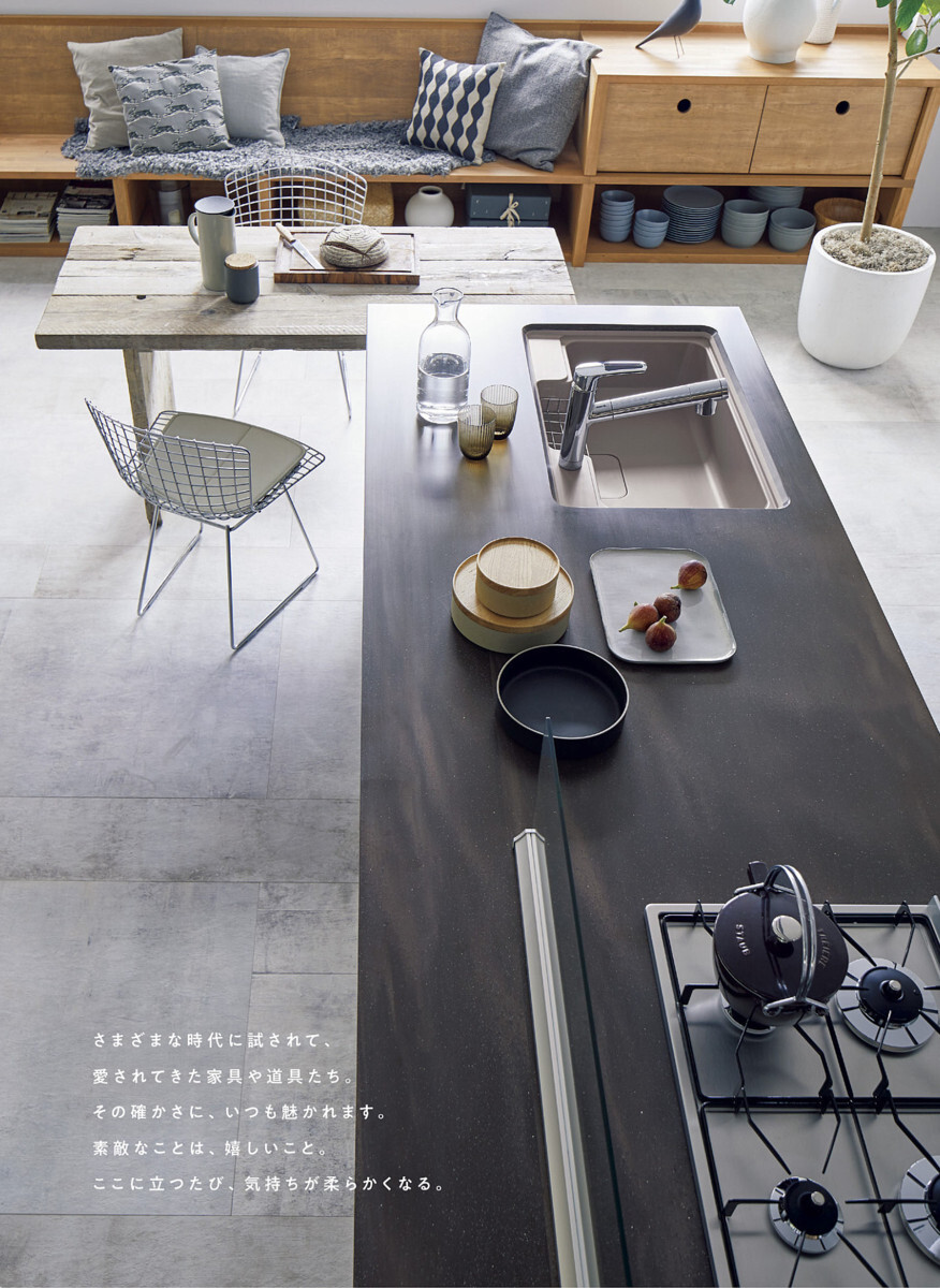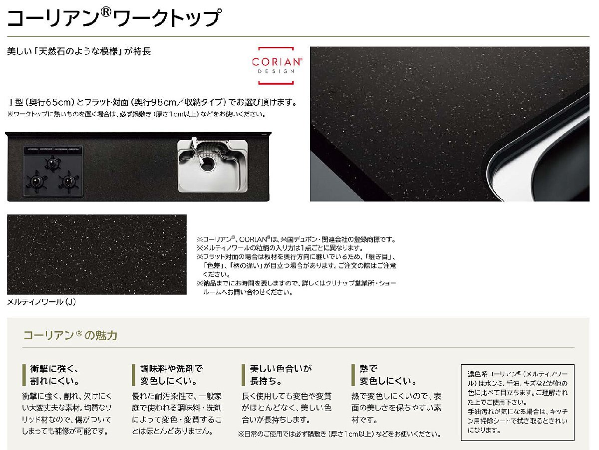 ◆ワークトップは熱に強く、天然石を思わせる、コーリアンの人工大理石。