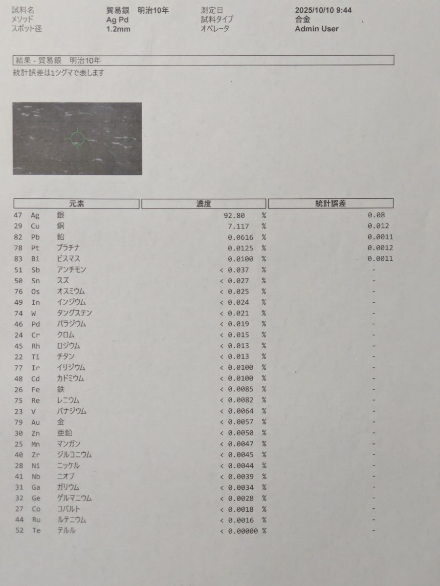 貿易銀明治10年【専門機関の成分分析表付】です。