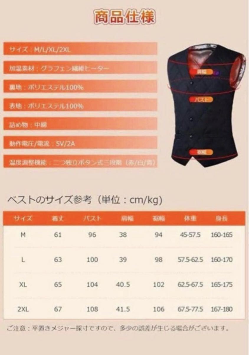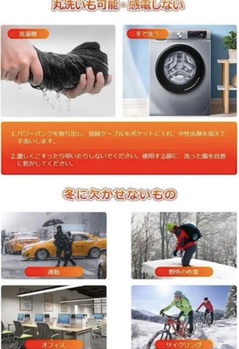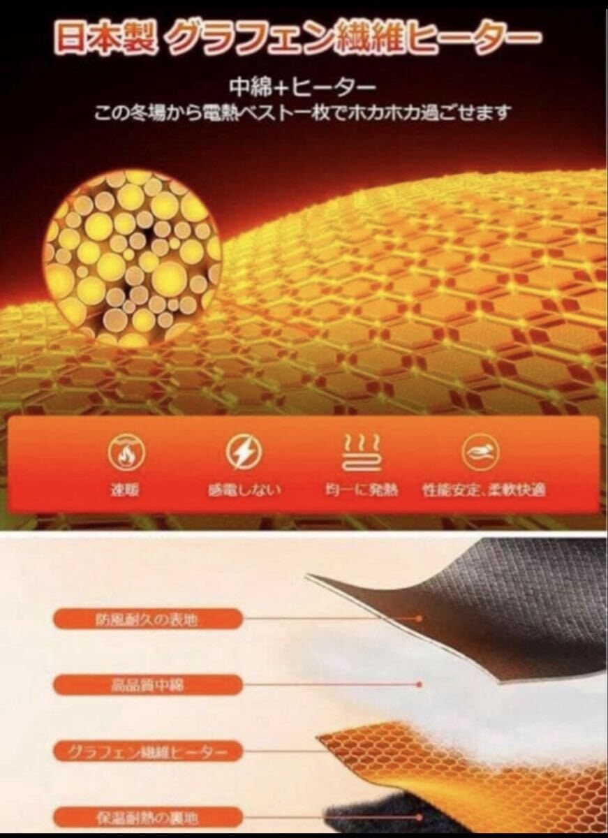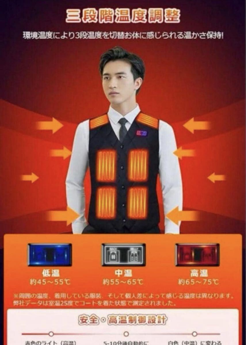 温度制御スイッチを3秒間長押しし電源がオンして、赤色のライトが点灯し、5分後に自動的に白色に変わります。これは高温加熱から中温への自動温度制御です。途中で他の温度を手動で切り替えることもできます。日本製グラフェン繊維ヒーターを採用し、違和感なく着用可能、電源を入れた後、約5秒ぐらい温まり始め、1分間ほど暖かさが広がります。加熱服の中身にはふんわりした柔らかい中綿入り、もこもこして優れた防寒性を持ち、ヒーターとの組み合わせで熱を逃さず、しっかり暖かさをキープしてくれて、寒い外を歩いても体がポカポカ。