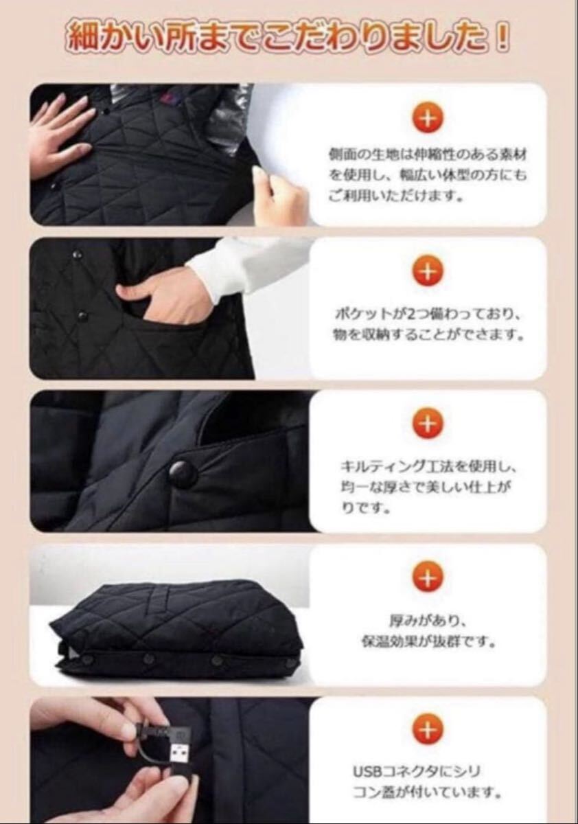 前には6つ、後ろには10個の内蔵ヒーターがあり、寒い季節でも快適に暖かく過ごすことができます。サイド部分は伸縮性のある素材を使用しており、体型にフィットします。