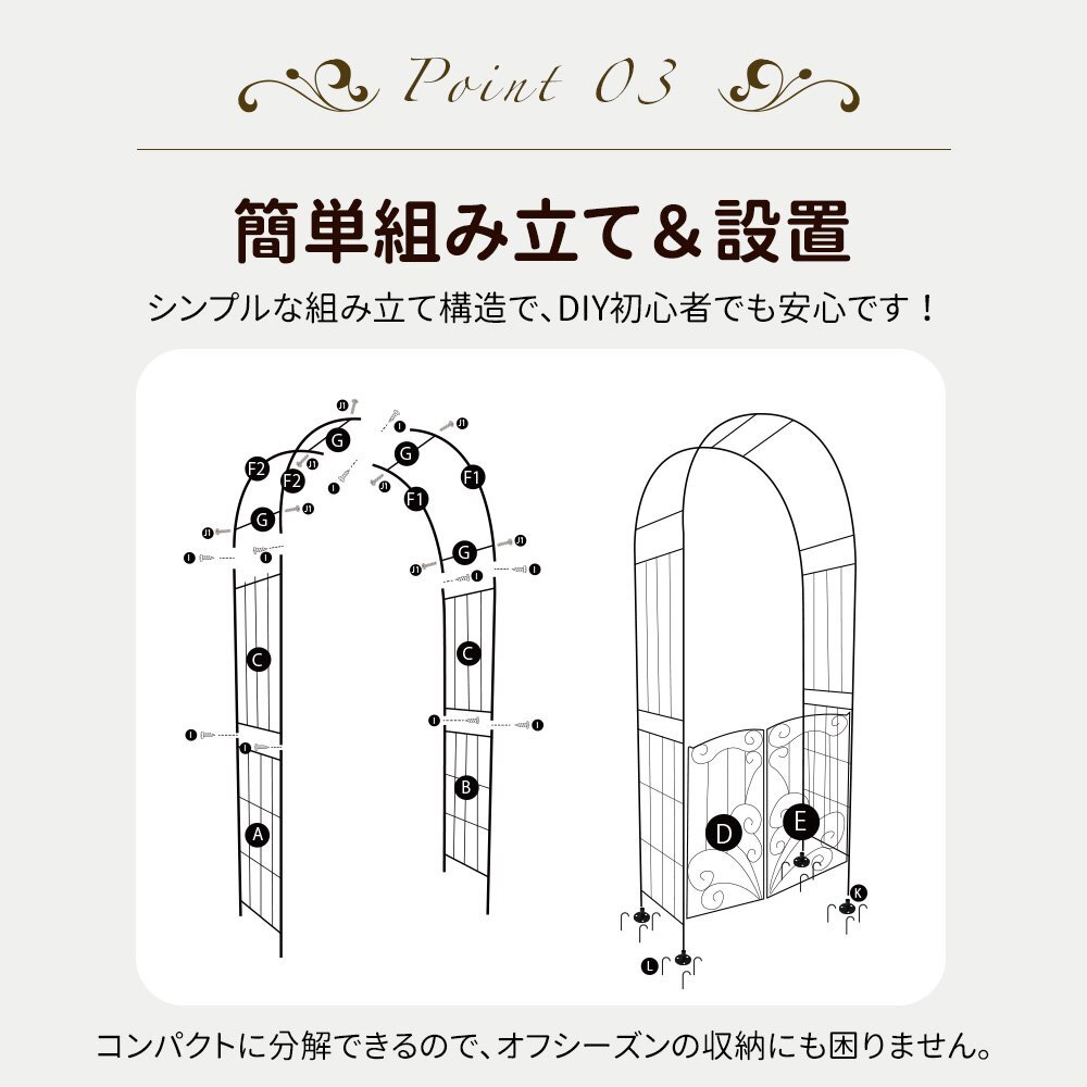 • ◎02 エレガントなアーチデザイン 美しい曲線を描くアーチが、自然と調和したナチュラルな雰囲気に。ガーデンアーチ&ゲートセット で、まるでヨーロッパの庭園のような素敵な空間を作りませんか?色とりどりの花を絡ませて、このアーチで大切な瞬間を彩り、素晴らしい視覚的な魅力を楽しんでください!