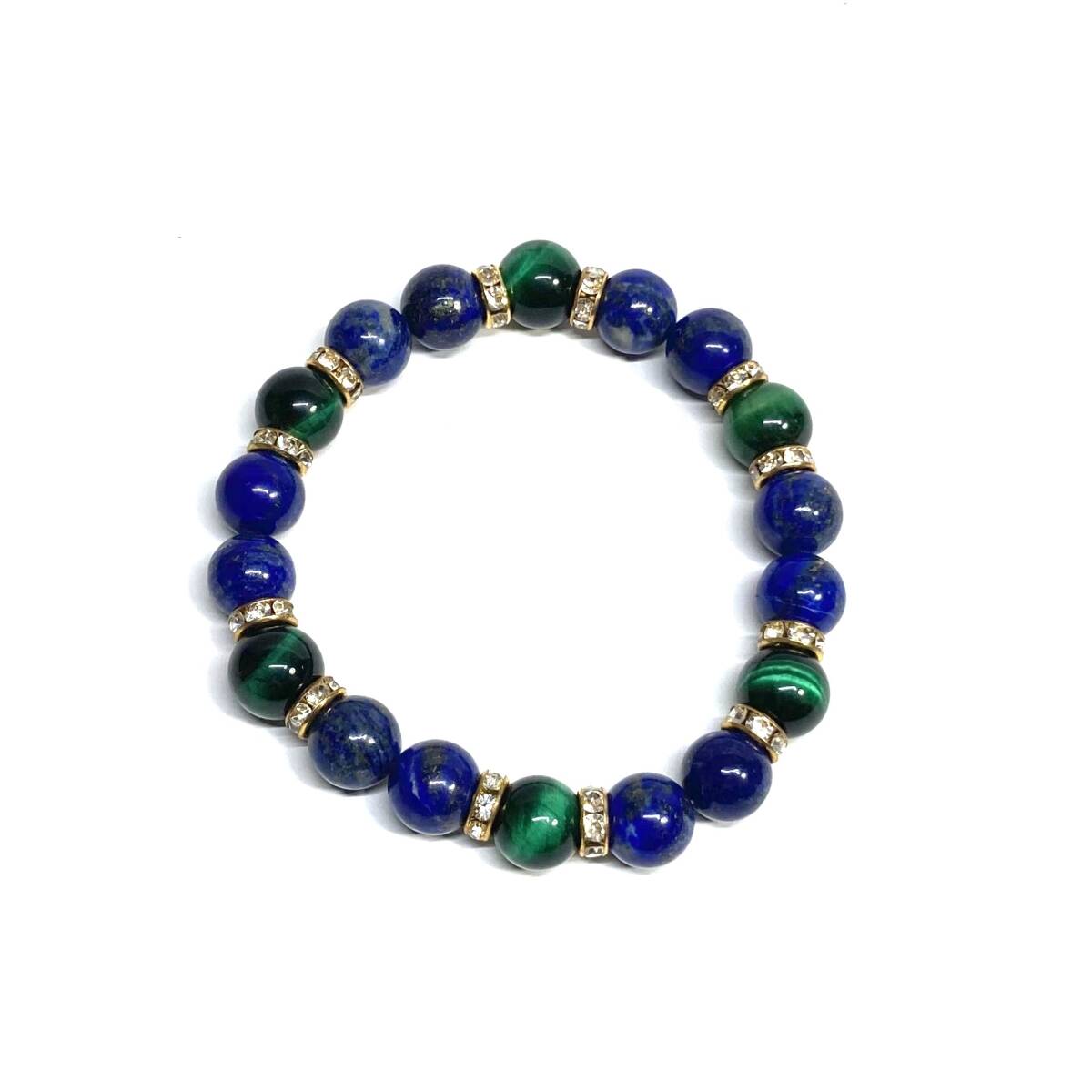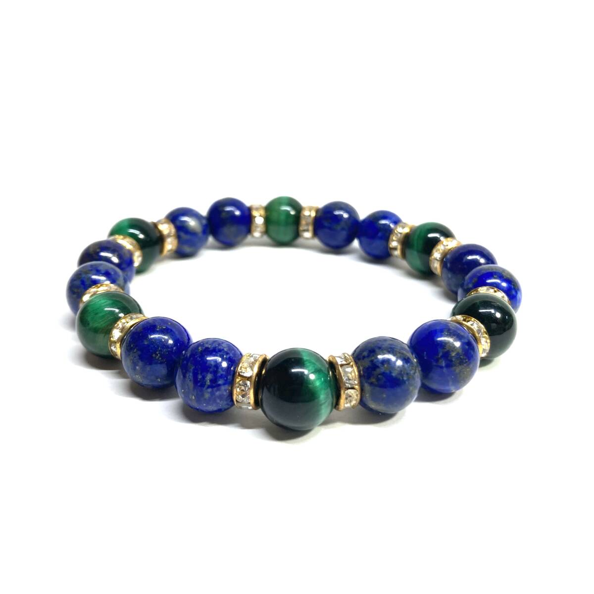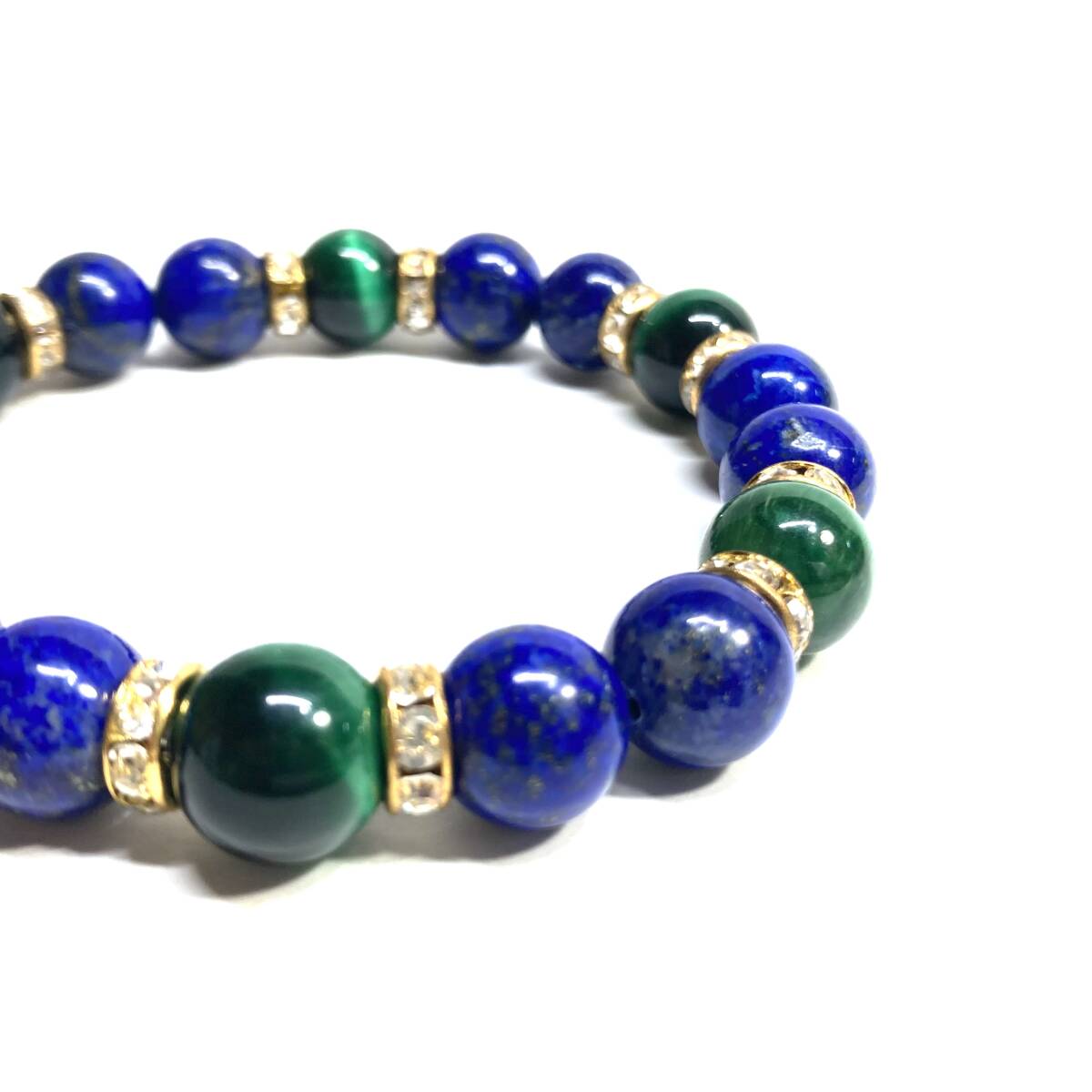こちらは、ラピスラズリとグリーンタイガーアイを組み合わせたパワーストーンブレスレットです。間にはロンデルを挟み高級感あるデザインに仕上げております。石大きさは腕にも馴染みやすいように10mm玉で内径約18cm(伸可能)です。(サイズ変更の場合は取引ナビにてご連絡をお願いします。) 数に限りがございますので気になる方はお早めにどうぞ。