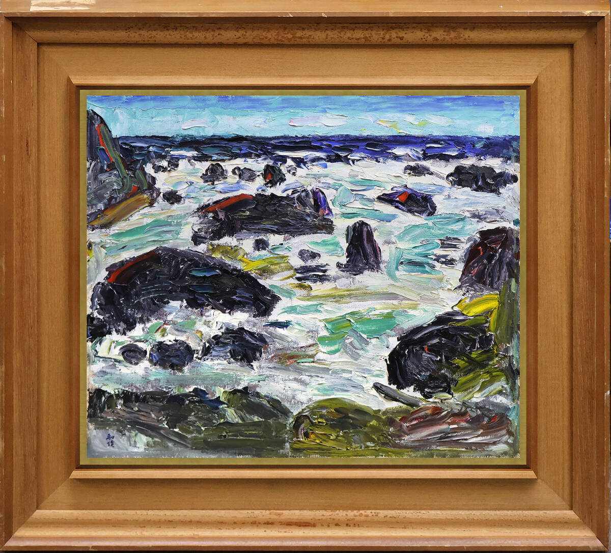 画家:小林和作 タイトル:海 技法:キャンバスに油彩 画面サイズ:45×53㎝ 額サイズ:66×74㎝ サイン:左下にサイン 裏にタイトル・サイン コンディション:部分的にイタミがあります。 小林 和作 (こばやし わさく) 1888年 山口県出身 上京 田中頼璋に師事 1904年 京都市立美術工芸学校絵画科入学 川北霞峰に師事 1908年 京都市立美術工芸学校絵画科卒業 1910年 京都市立絵画専門学校日本画科入学 竹内栖鳳に師事 文展入選 1913年 京都市立絵画専門学校日本画科卒業 文展褒状授与 1920年 鹿子木孟郎画塾に入塾 1922年 上京 1924年 春陽会展入選 1927年 春陽会会員に推挙 1928年 ヨーロッパ各地を巡遊 1929年 帰国 1934年 春陽会退会 独立美術協会会員に推挙 広島県尾道市に転居 1935年 尾道美術協会設立 1953年 独立美術協会展出品 芸術選奨文部大臣賞受賞 1974年 没(享年86歳) 所蔵/東京国立近代美術館、京都国立近代美術館、東京都現代美術館、福井県立美術館、 静岡県立美術館、愛知県美術館、長野県信濃美術館、尾道市立美術館、佐久市立近代美術館、 諏訪市美術館、倉敷市立美術館、米子市美術館、ふくやま美術館、しぶや美術館、他多数 |