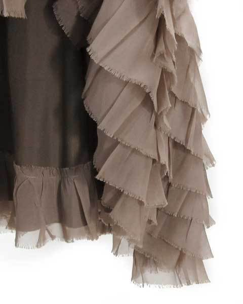 | 贅沢に重ねたシフォンフリルがフェミニンなスカート。スモーキーベージュで大人可愛い着こなしが楽しめます。存在感のあるデザインですのでシンプルなトップスとの相性が良い。お出かけスタイルやちょっとしたパーティースタイルにおすすめです。 |