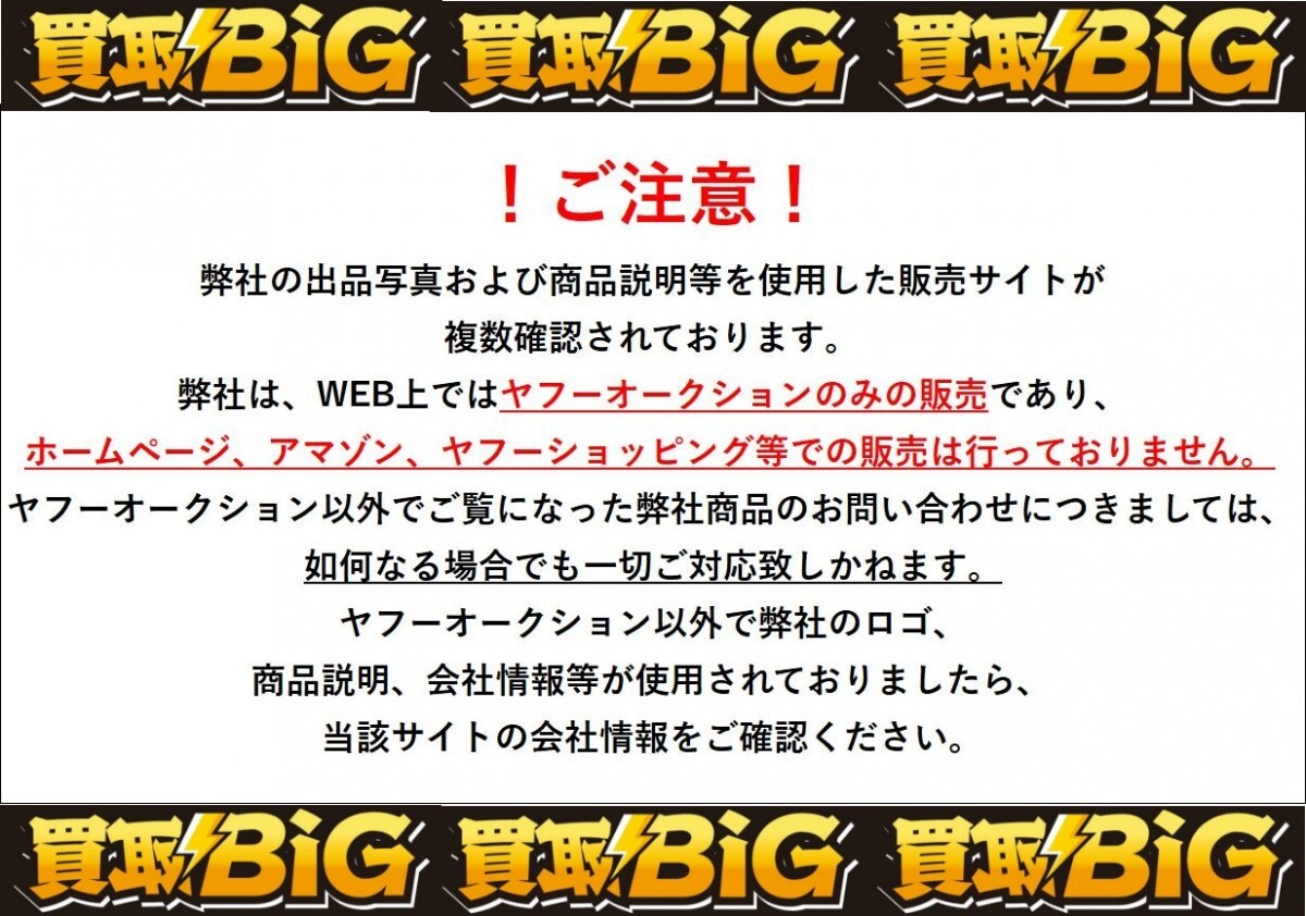 【領収書の発行】 ・インボイス対応です。 ・ご入金前に取引メッセージでご依頼ください。(宛名・但し書き明記) ・ご入金後の発行は原則承れません。 ・お客様都合による領収書のみの郵送、再発行は承れません。 【商品について】 ■ 中古品につき、現状渡しとなります。 状態確認・説明には万全を期しておりますが、見落としの可能性もございます。 ご理解のうえご入札をお願いいたします。 【ご入札に関して】 ■ 以下は対応不可となります。 ・営業時間外のご質問や入札取消 ・落札後のキャンセル・クレーム ■ 複数落札予定の際は事前にご連絡ください。 【落札後の対応】 ■ 営業日2日以内に落札者情報のご入力をお願いします。 期日を過ぎた場合、落札者都合でのキャンセルとなります。 ※営業時間後、店休日に落札された場合は、翌営業日にご連絡いたします。 【発送先について】 ■ 登録住所以外へ発送をご希望の場合は、 取引メッセージにて正確な送り先をご連絡ください。 ■ 送料確定後の配送方法と住所変更、発送後の宛名変更はできません。 【補償対応】 ■ 初期不良のご連絡は商品到着後7日以内にお願いいたします。 ※取置き期間も含みます。 ※補償期間内にお電話でご連絡いただければ返金・返品対応いたします。 ※1000円スタート売切商品は対象外です。 ※使用に伴う事故等の責任は負いかねます。 【ご注意】 ■ 実店舗でも販売しており、売約済みとなった場合は出品を取消すことがあります。 ■ 東海店・西尾倉庫店など異なる拠点間での「まとめて取引」「同梱」 および「別店舗への商品移動」は承っておりません。 ■ 当社は店頭およびヤフオクでのみ販売しております。 出品情報を悪用した詐欺サイトにご注意ください。 |