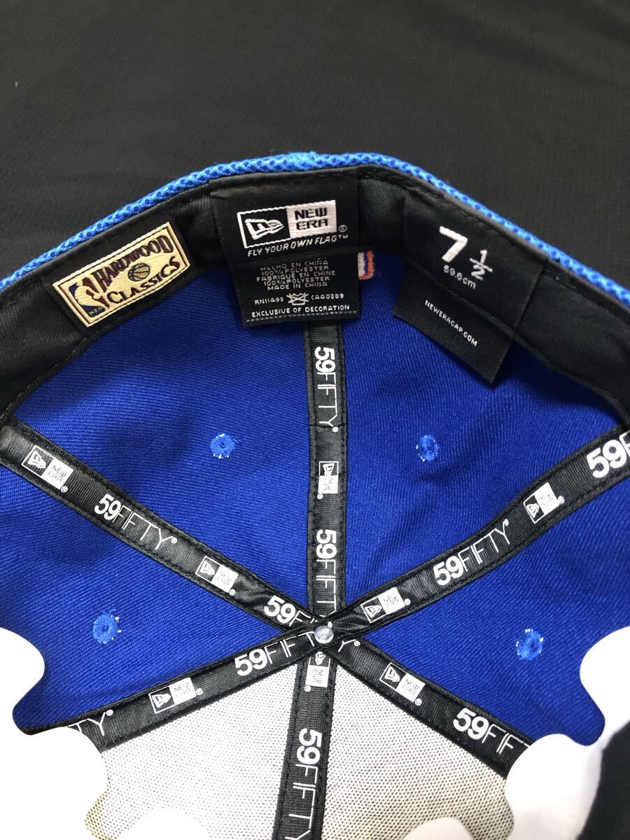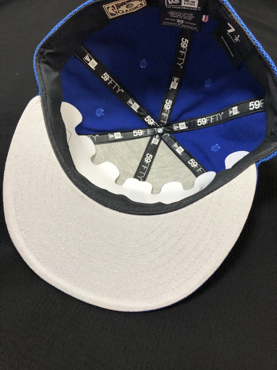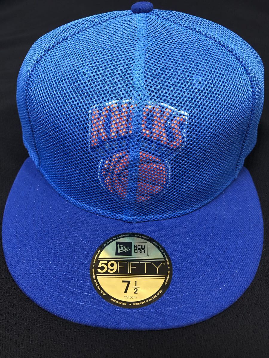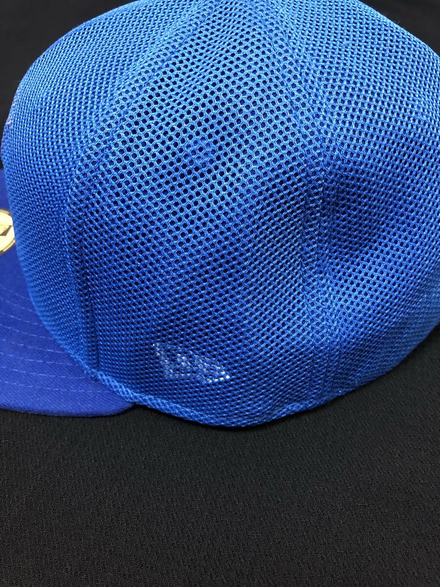 青のニューエラのキャップにメッシュ素材を被せたキャップです。青いメッシュ素材の59FIFTYキャップ、バスケットボールチームロゴ付き。