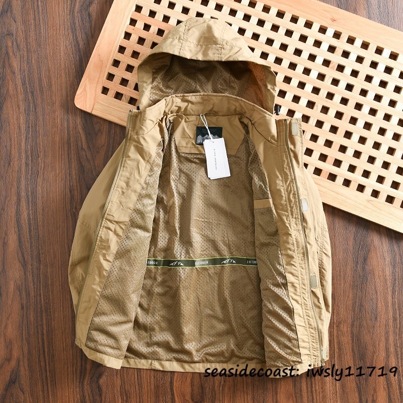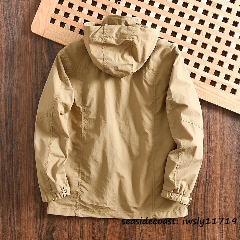 新品◆アウトドア ジャケット メンズ フード付き 春秋 マウンテンパーカ 胸ポケット 防風防寒 撥水 アウター 登山 カジュアル カーキ M