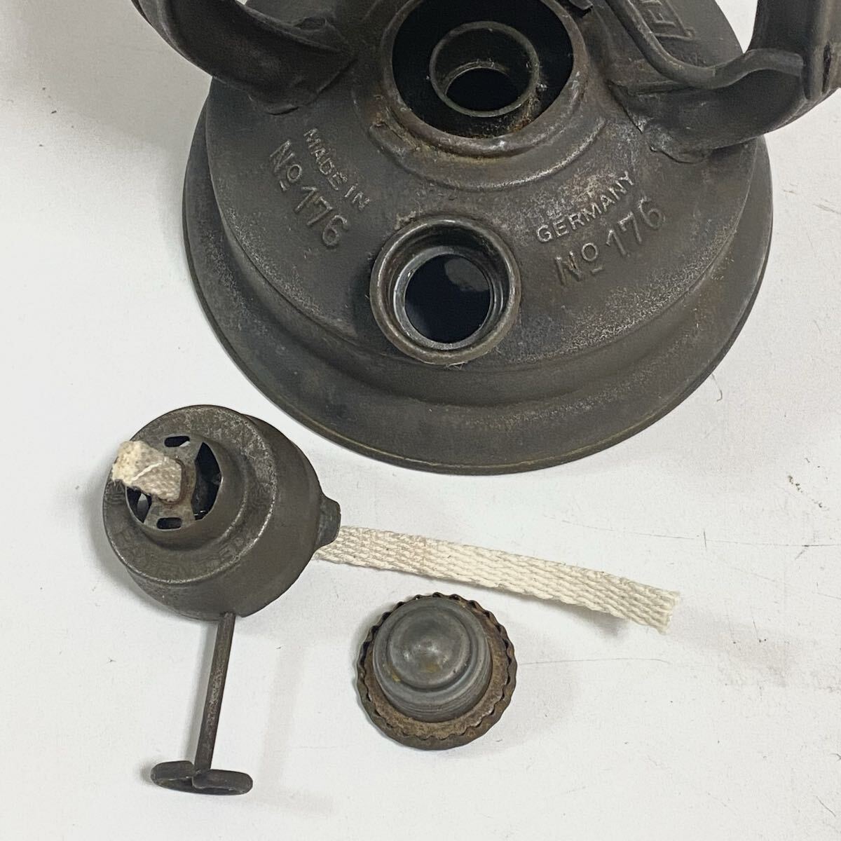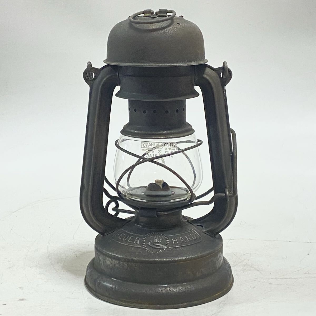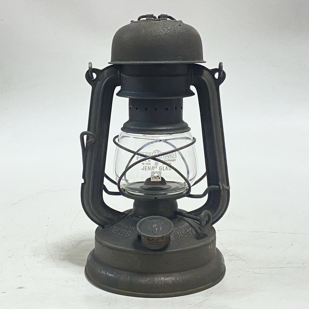 | ご覧いただきありがとうございます。 Feuerhand フュアーハンド 176e マッシュルームヘッド 1939年から1943年までのごく短期間のみ生産され 第二次世界大戦中のドイツ軍で使用されていた 軍用のハリケーンランタンです。 長時間燃焼が出来るように2分芯使用のバーナーとなっています(通常の176は3分芯使用)。 その形状からマッシュルームヘッドの愛称で人気が高いモデルです。 希少なモデルで海外でも高値となっています。 キズ・サビ・汚れがありますが、ビンテージとしては良い状態だと思います。写真で状態のご確認をお願い致します。 ウィックの上下、バーナー部脱着、燃料キャップの脱着、タンクの漏れはありません。 ホヤを持ち上げは問題ありませんが、レバーの保持が出来ません。 (レバーを抑えたまま点火すれば問題ありません) 本体高さ 21cm | ||