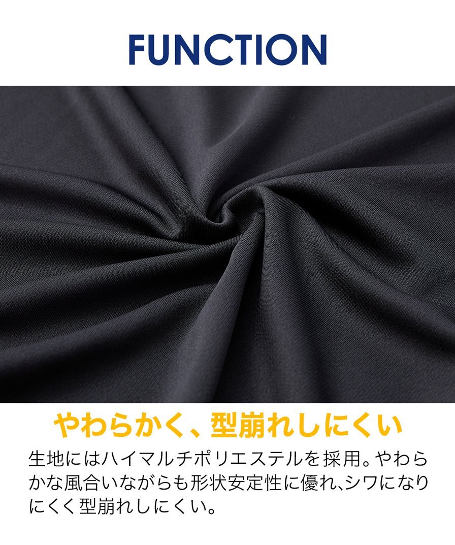 生地の内側全体と脇下をメッシュ生地にすることでムレにくく、肌ばなれの良さで汗のベタつき感を軽減。